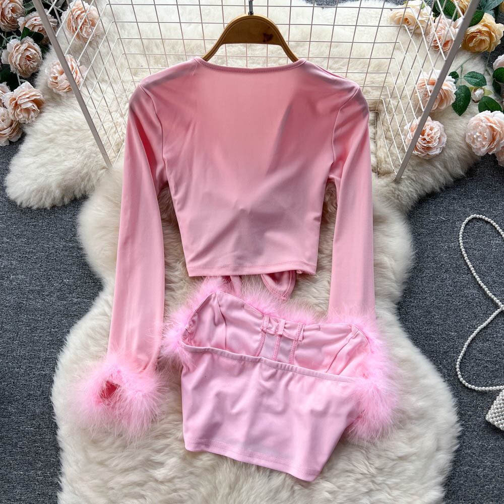 ヨーロッパとアメリカの春のスパイスガールズフマオステッチスーツ女性の V ネック長袖 Tシャツ + 短いラップ胸 2 点セット ショート ロング スプリング 春物 Vネック ヨーロピアン lyxaj95257422737
