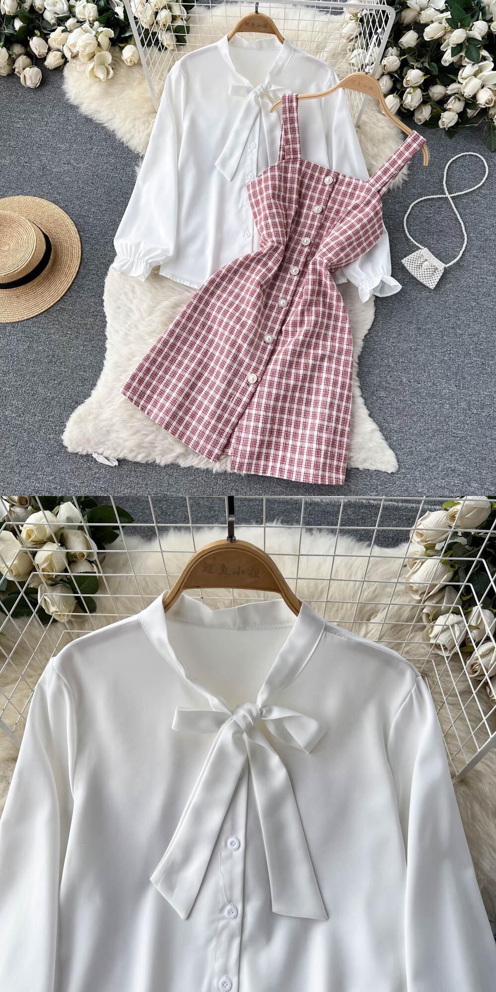 フランス風の小さな格子縞のスリング ドレス ツーピース スーツ女性の秋のちょう結びランタン スリーブ シャツ トップ ランタンスリーブ リボン オータム 秋物 lyxaj84225922117