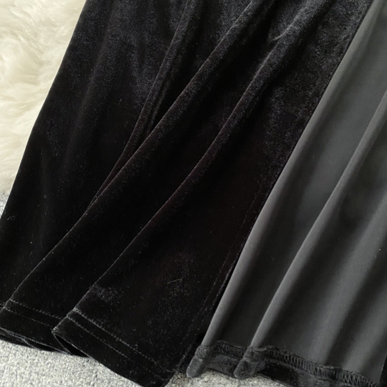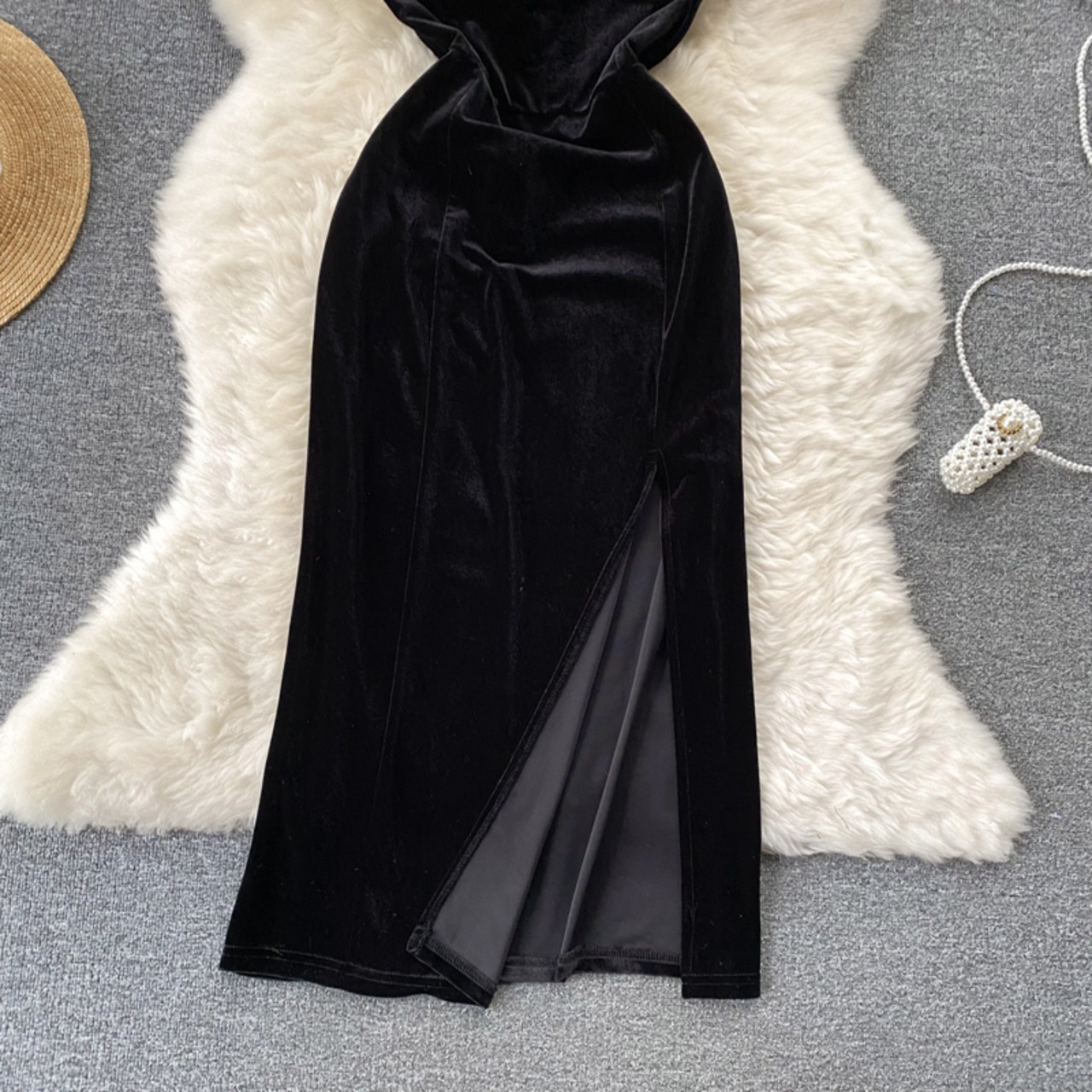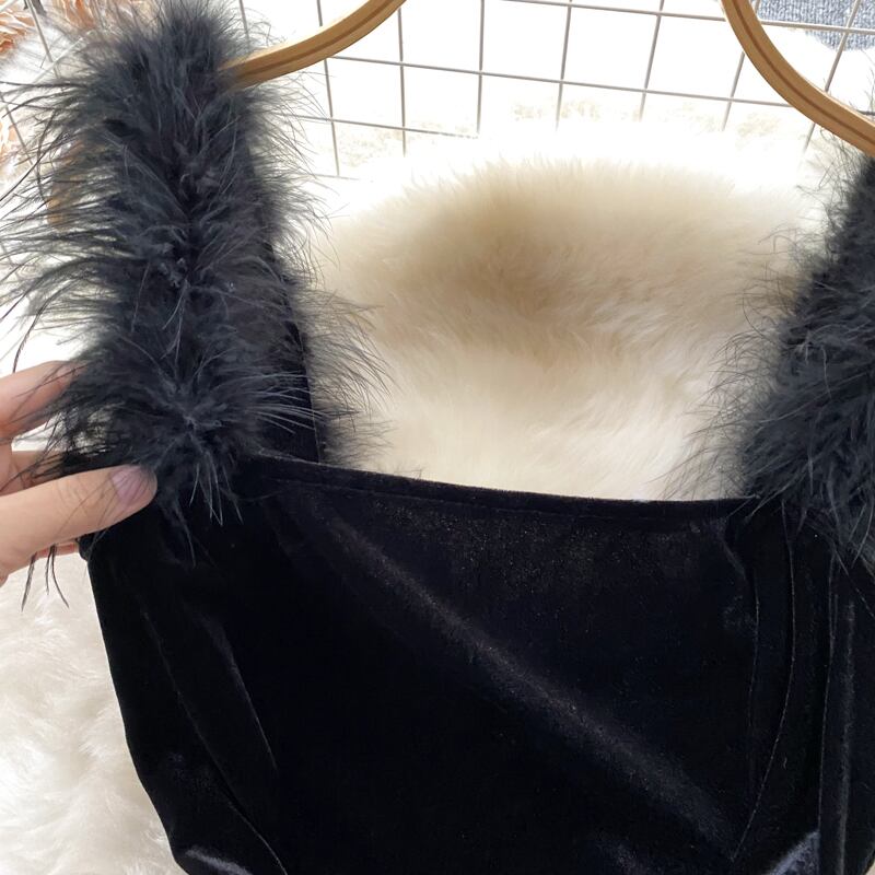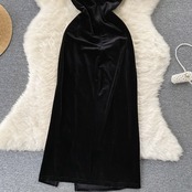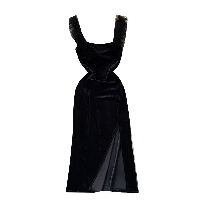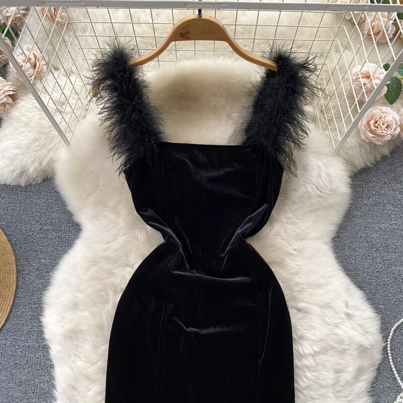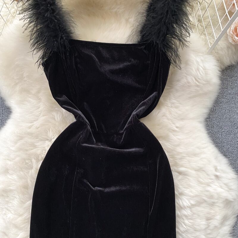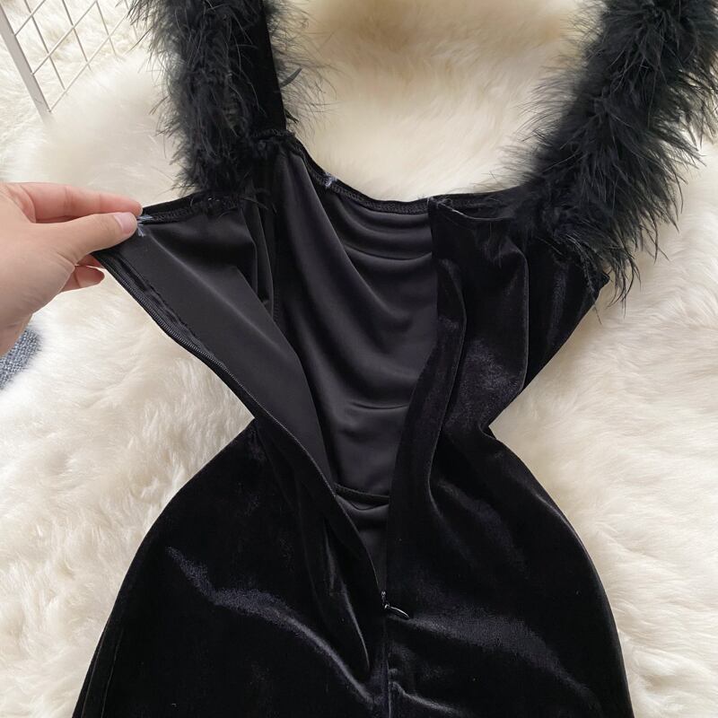 春と秋のフランスのセクシーな毛皮のようなサスペンダー ドレス女性の多彩なレトロ スリット ベルベット バッグ ヒップ レディ リトル ブラック ドレス スプリング 春物 オータム 秋物 lyxaj3414508047