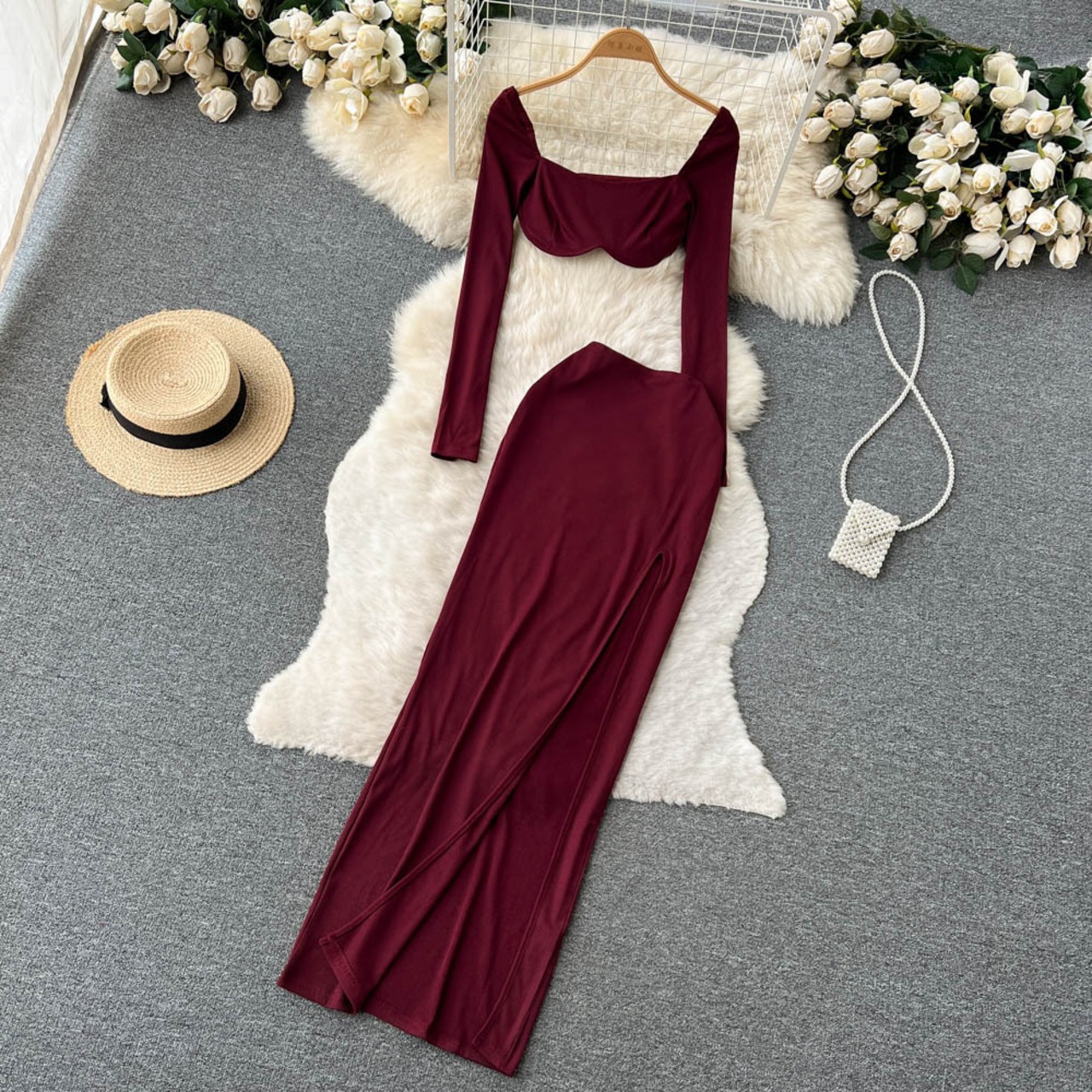 スパイススーツレディースカラー長袖ショートチューブトップ+セクシースリットミドル丈スカートツーピーストレンド ロング lyxaj66588872925