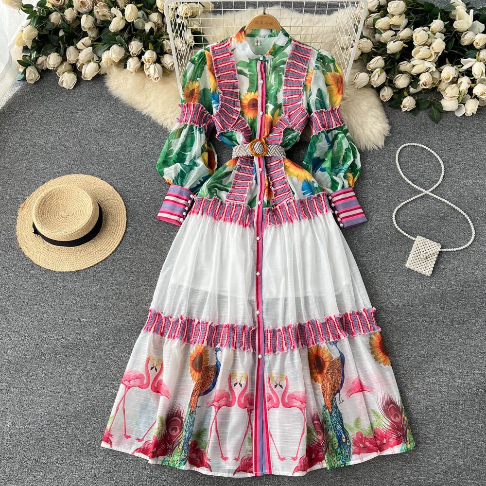 ヨーロッパとアメリカのレトロなプリント ドレス女性の感覚長袖コントラスト カラー スタンド カラー フリル ステッチ メッシュ ロング ドレス ヨーロピアン lyxaj38151663423