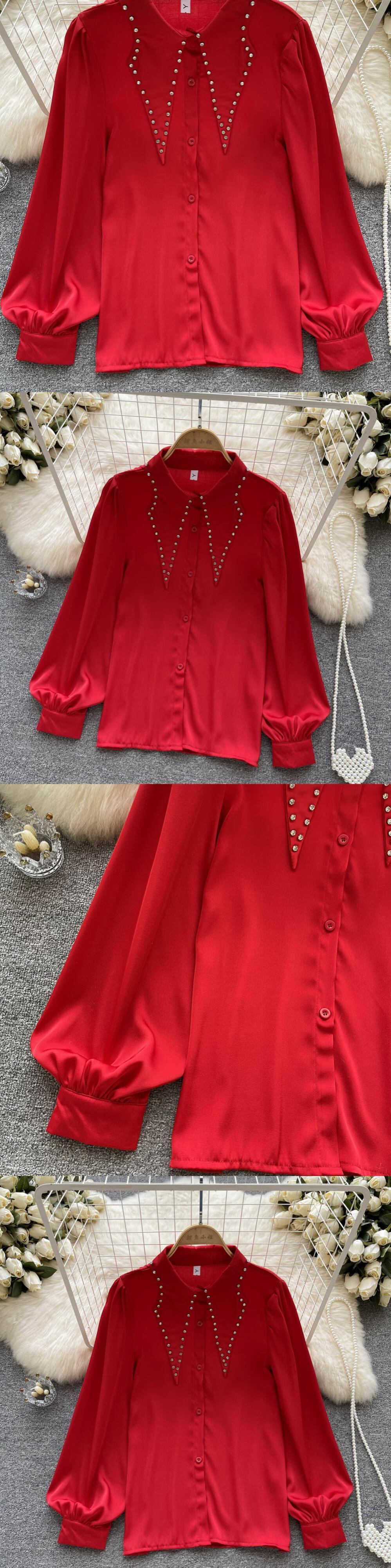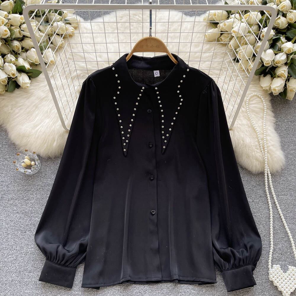 シャツ女性デザインセンスニッチビーズラペルファッションオールマッチ無地長袖シャツ 2022 年秋新作トップ ロング オータム 秋物 ソリッドカラー lyxaj11563281821