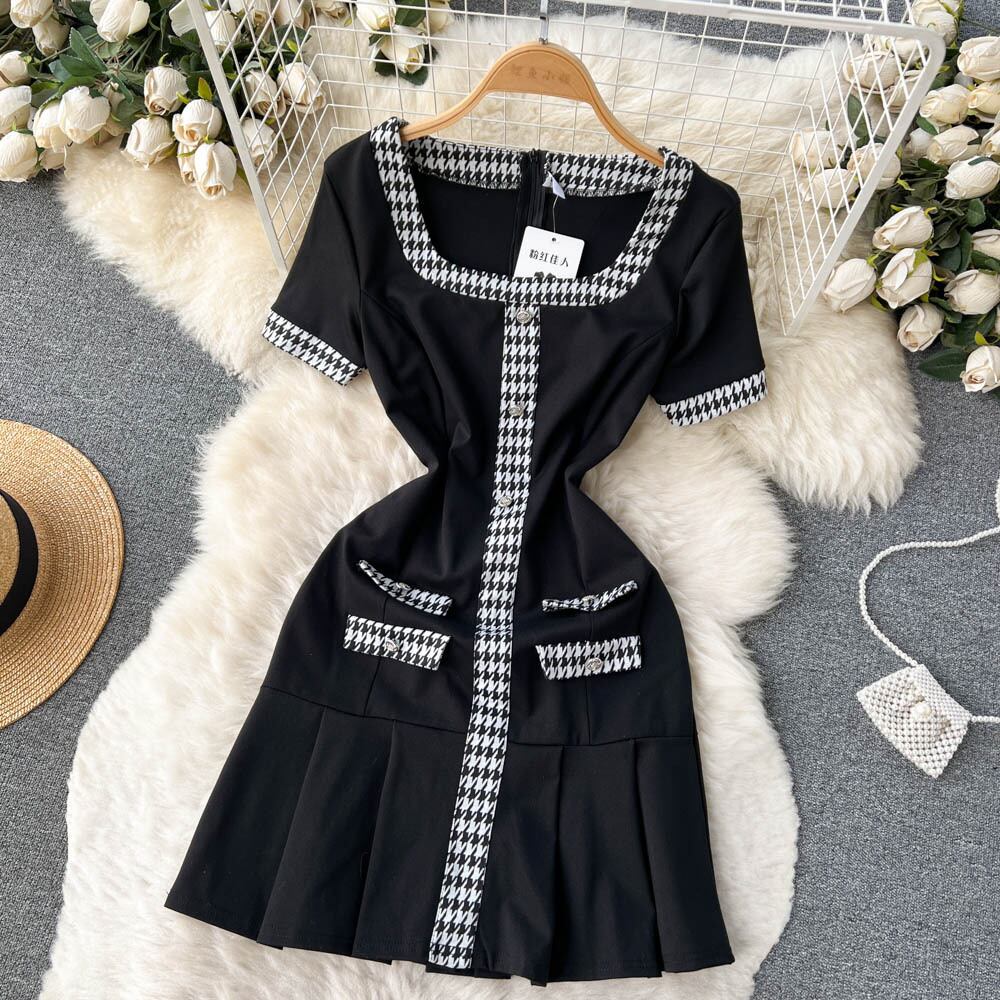 夏バージョンの気質の女性シャオシャン スタイル ステッチ半袖スクエア カラー ウエスト スリム ドレス プリーツ スカート サマー 夏物 スクウェア lyxaj10830405676
