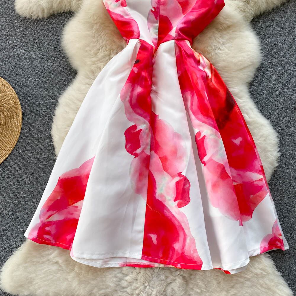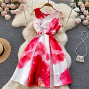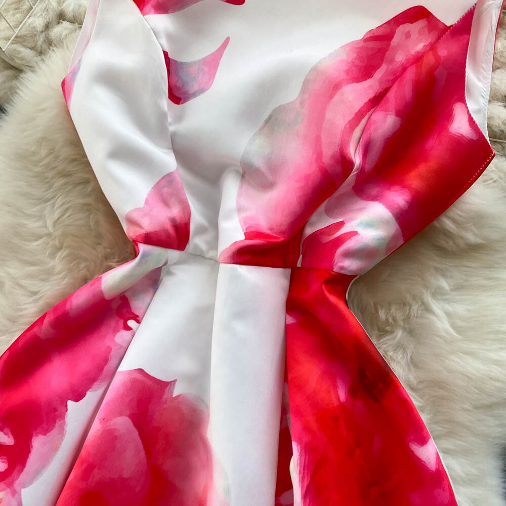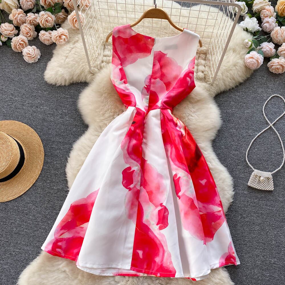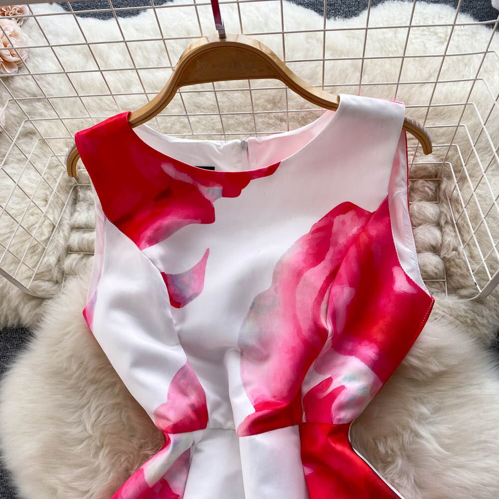 - シックで美しいプリントのノースリーブ ドレス夏の女性のフレンチ ウエスト見事なベスト A ライン スカート サマー 夏物 Aライン lyxaj4879415153