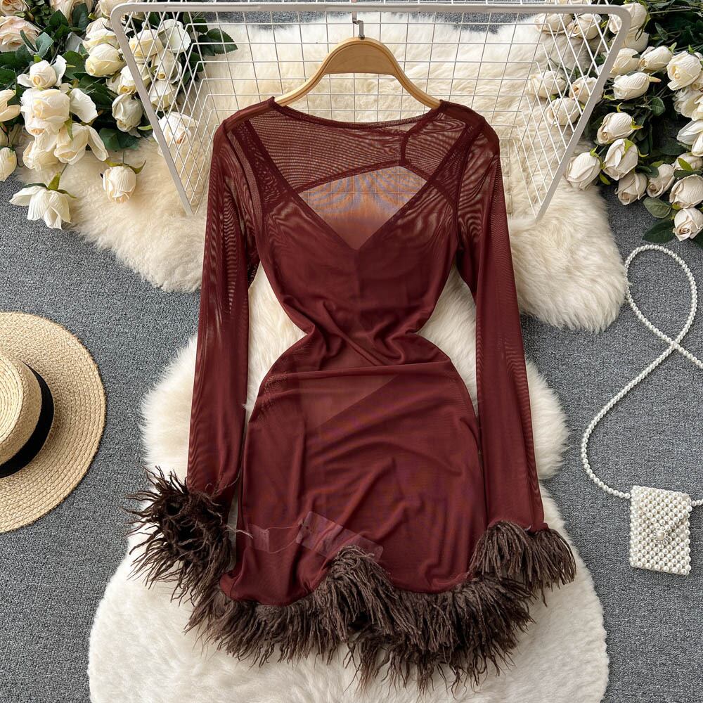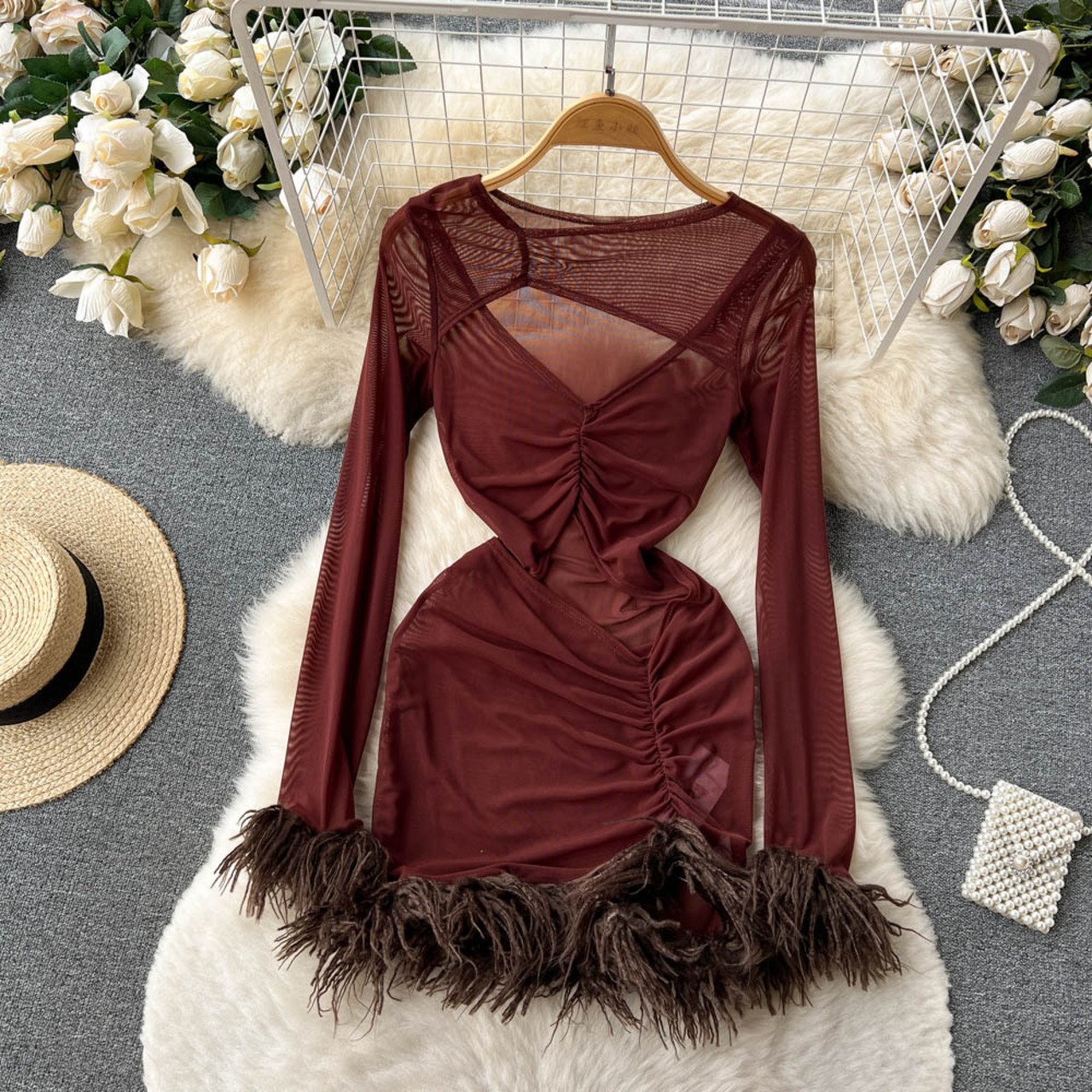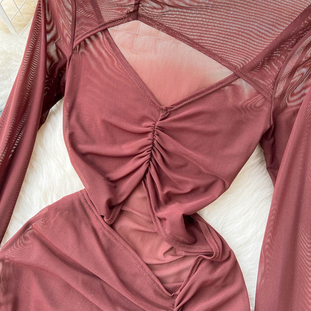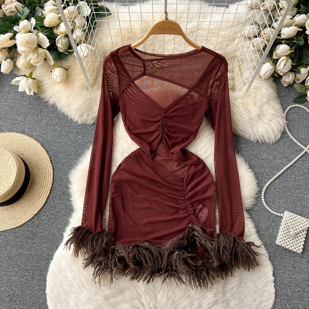 純粋な欲望のスタイルのセクシーな中空のドレスの女性の春と秋の新しいデザインの折り目のフリンジ付きバッグヒップスカート スプリング 春物 オータム 秋物 lyxaj82041907823