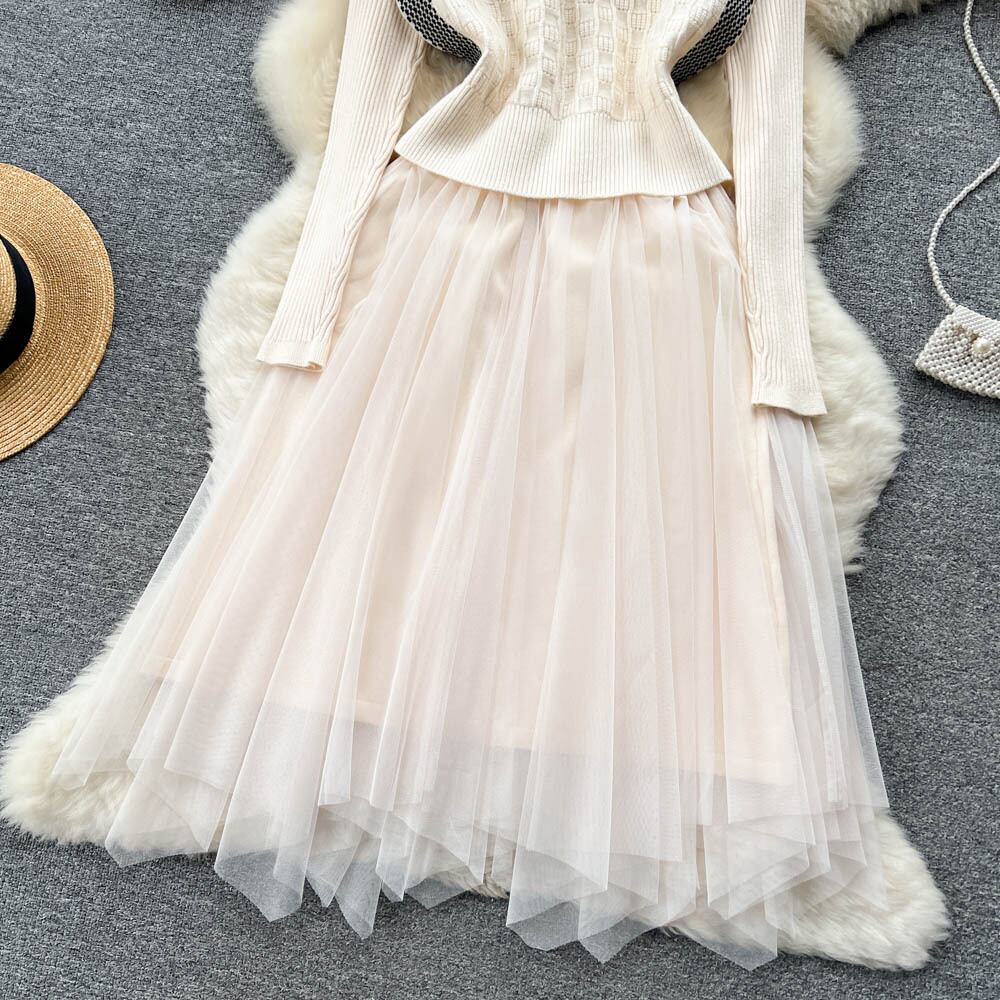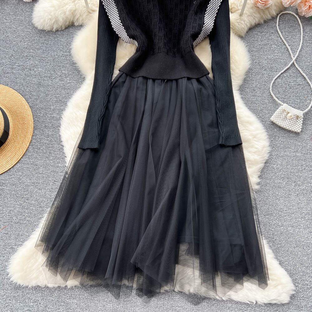 フェイクツーピースフレンチスタイルの小さなフレグランスニットスプライシングスプライシング不規則なメッシュドレスレディースロングスリーブミドルレングスフェアリースカート lyxaj13694774996