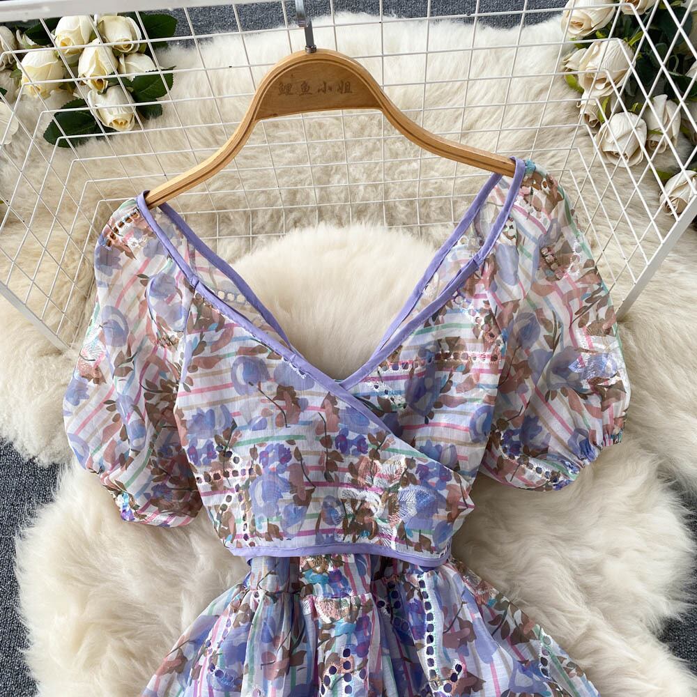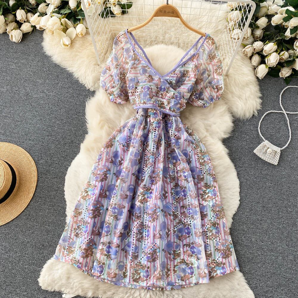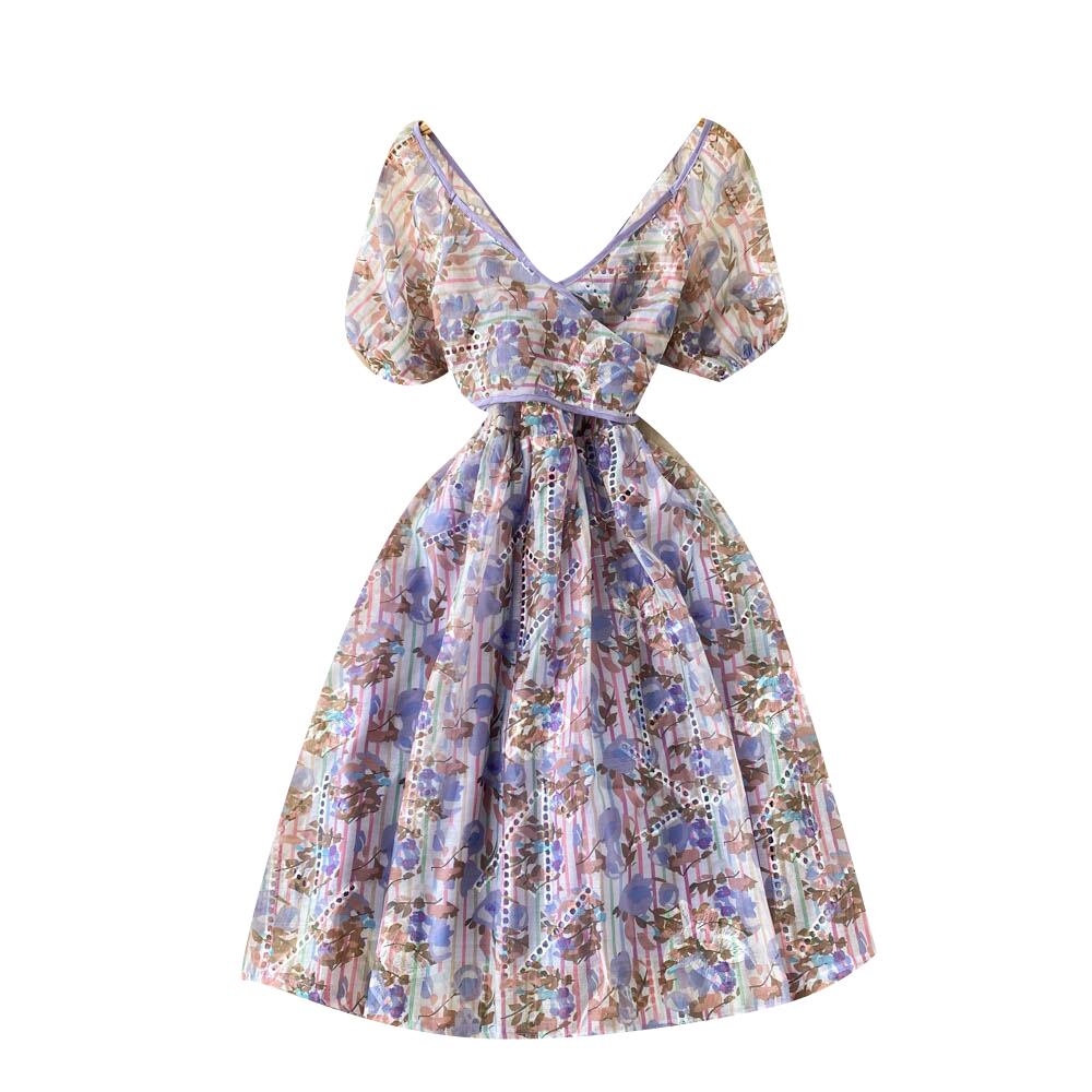 洋ナシの形をした小さな気質のVネックのドレス夏の女性の海辺の休日の花柄の半袖ウエストスカート サマー 夏物 lyxaj41156210345