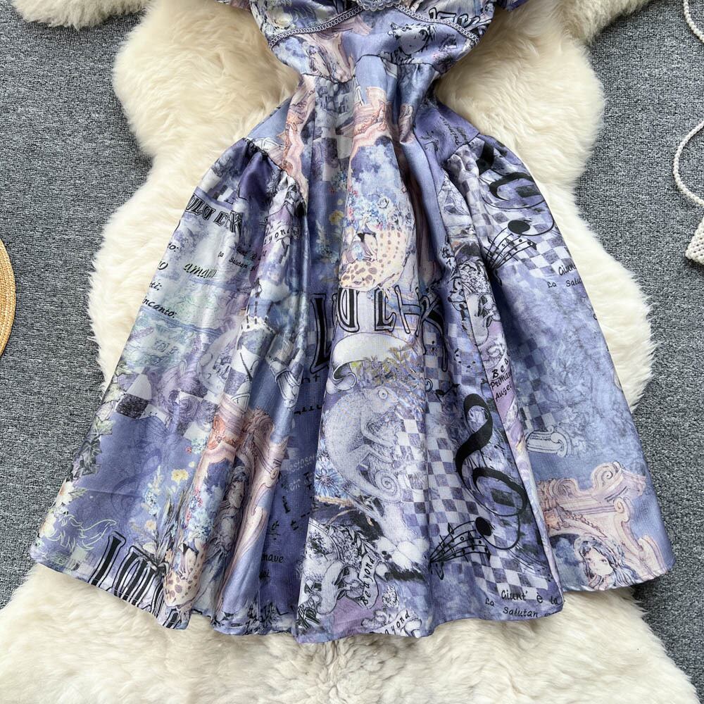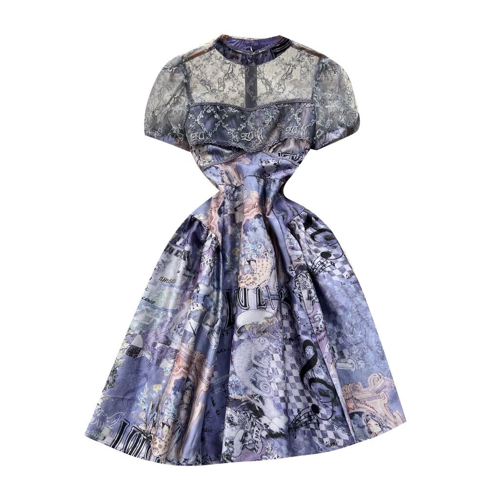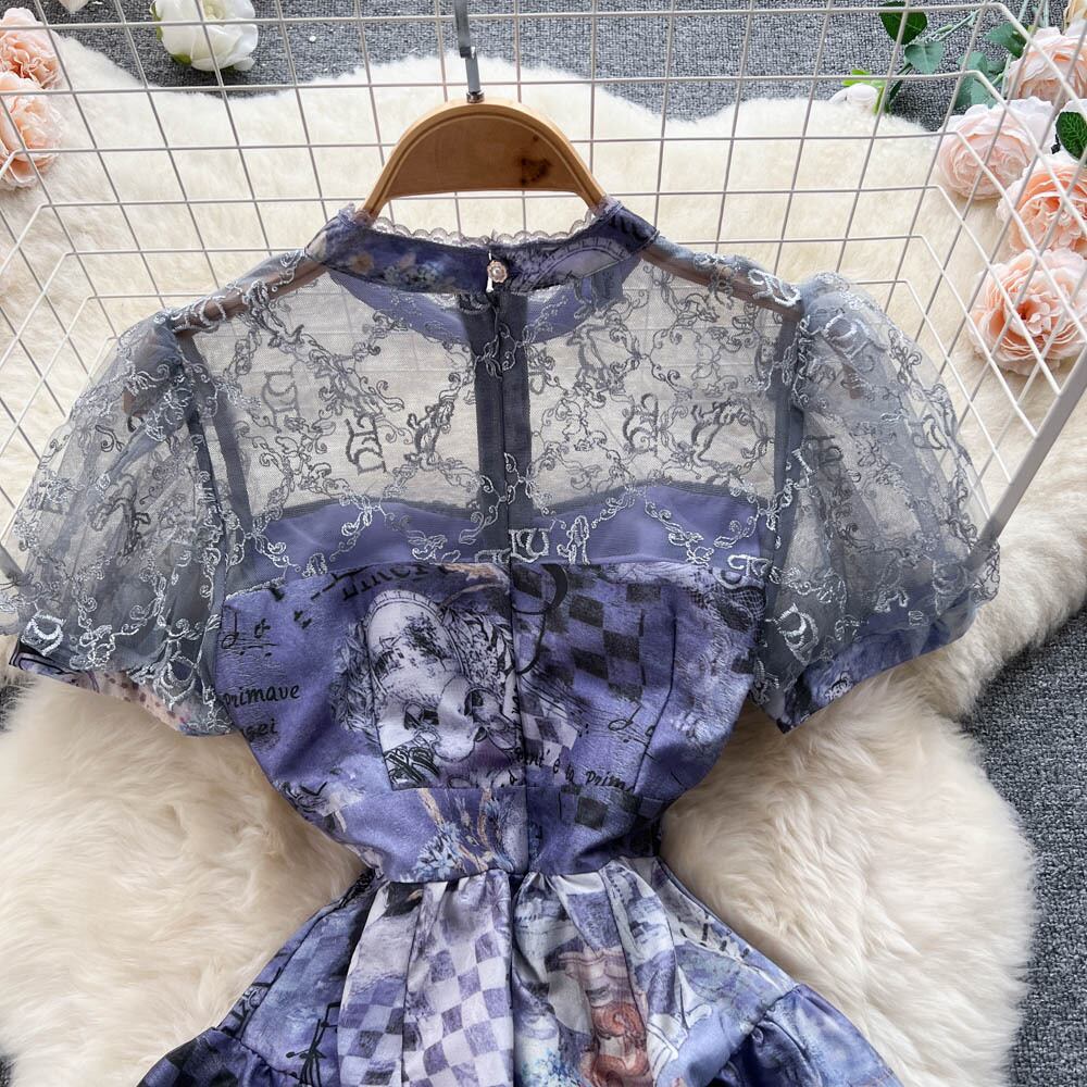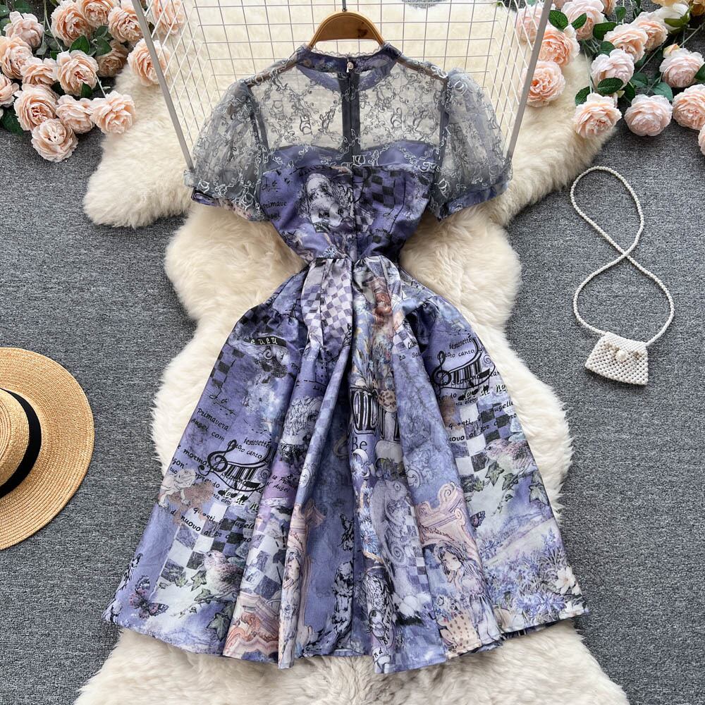 -エンド ニッチ デザイン レース ステッチ プリント パフ スリーブ ドレス夏女性のフレンチ ウエスト A ライン スカート サマー 夏物 Aライン lyxaj95699380486