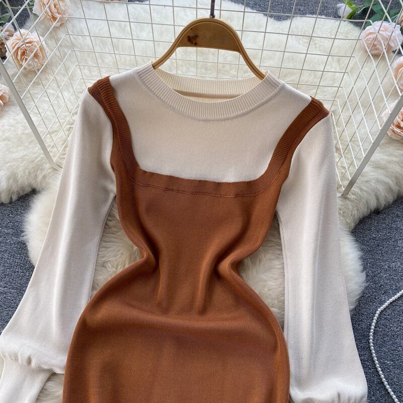 ニットフェイクツーピースドレスレディース秋冬新作ニッチデザインセンスコントラストカラースプライシングスリムショートボトムススカート オータム 秋物 ウィンター 冬物 lyxaj80689790153