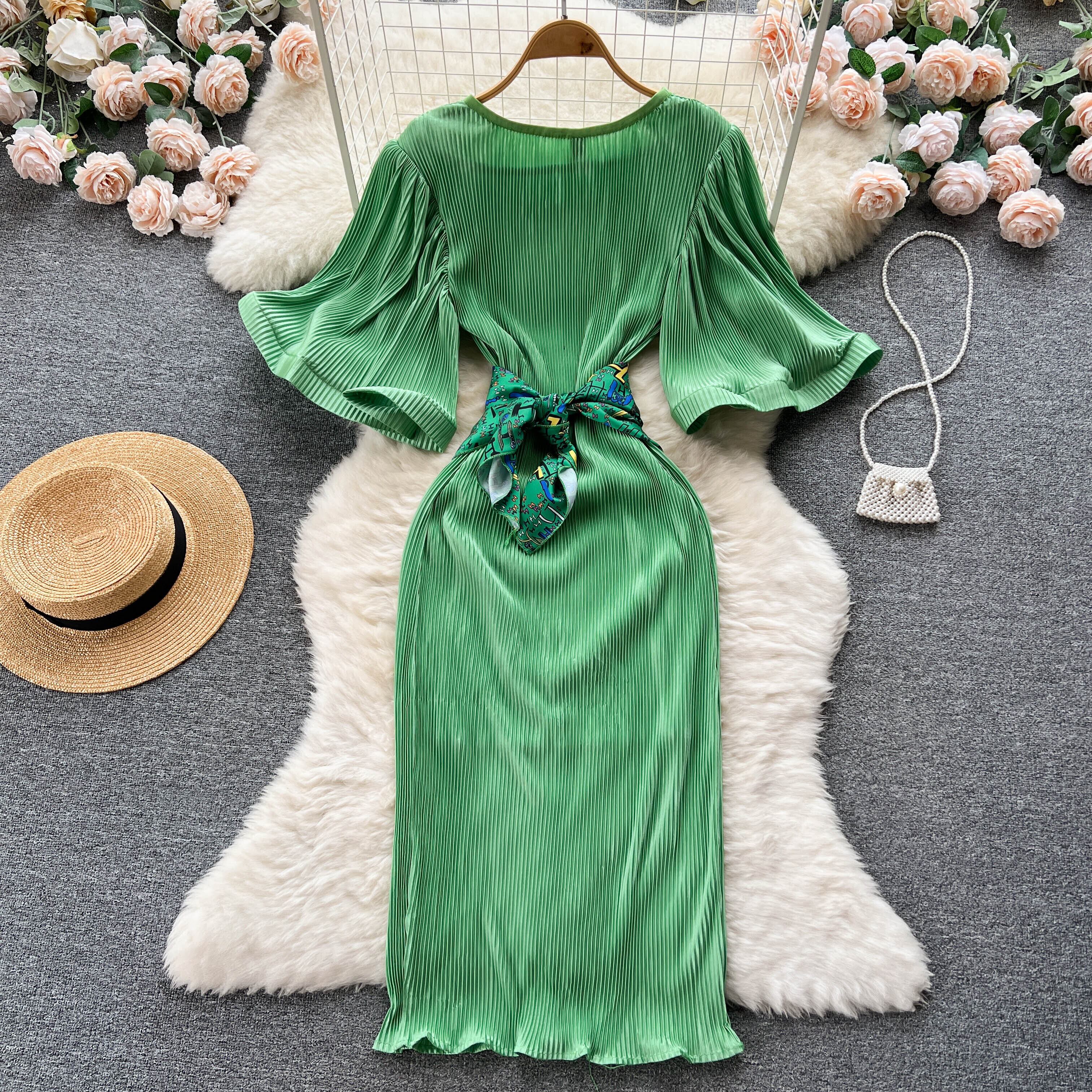 秋の新スタイルレディースフレンチプリーツドレス女らしさ自己修養スリム蓮の葉の袖ウエストバッグヒップロングスカート オータム 秋物 lyxaj77967602872