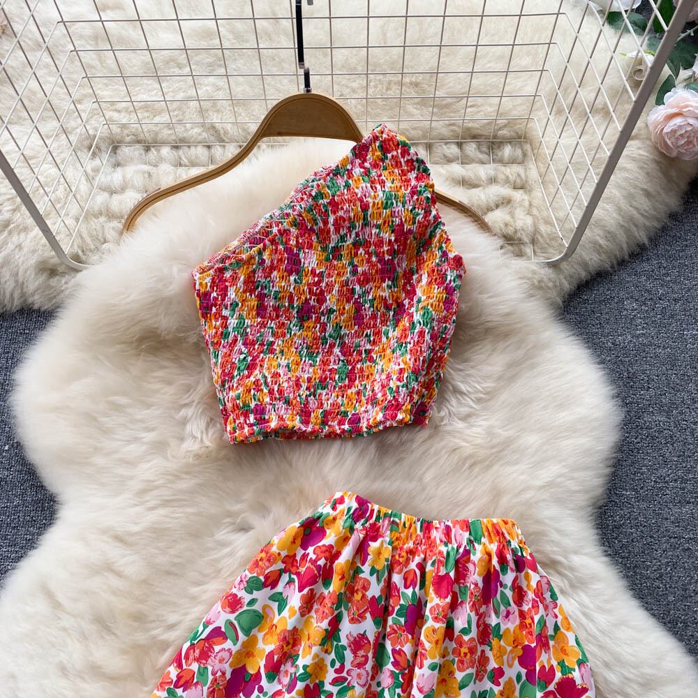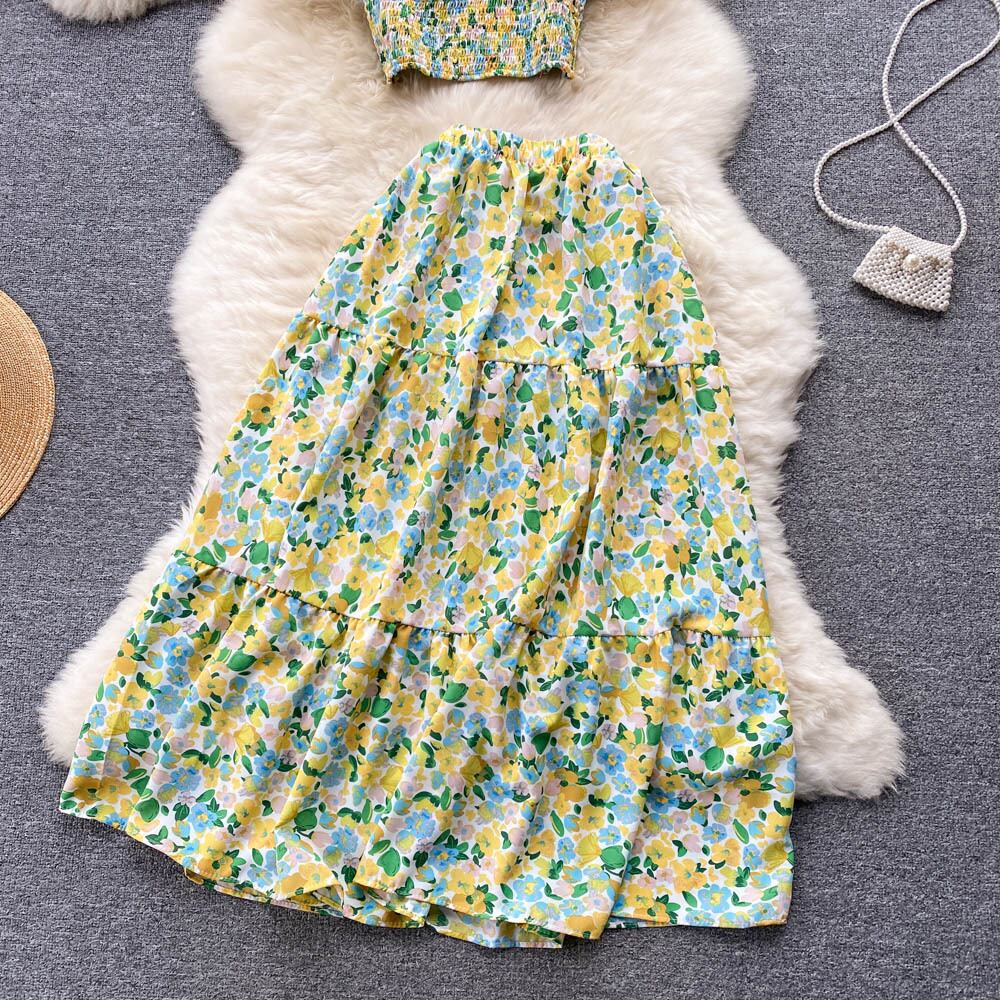 ホリデー風ブロークンフラワースーツ女性の夏の新しい甘くてスパイシーな風揚げストリートショートトップハイウエストビッグスイングスカート2点セット ハイウェスト 大人ガーリー スウィート キュート カジュアル サマー 夏物 フラワーデザイン lyxaj33259137291