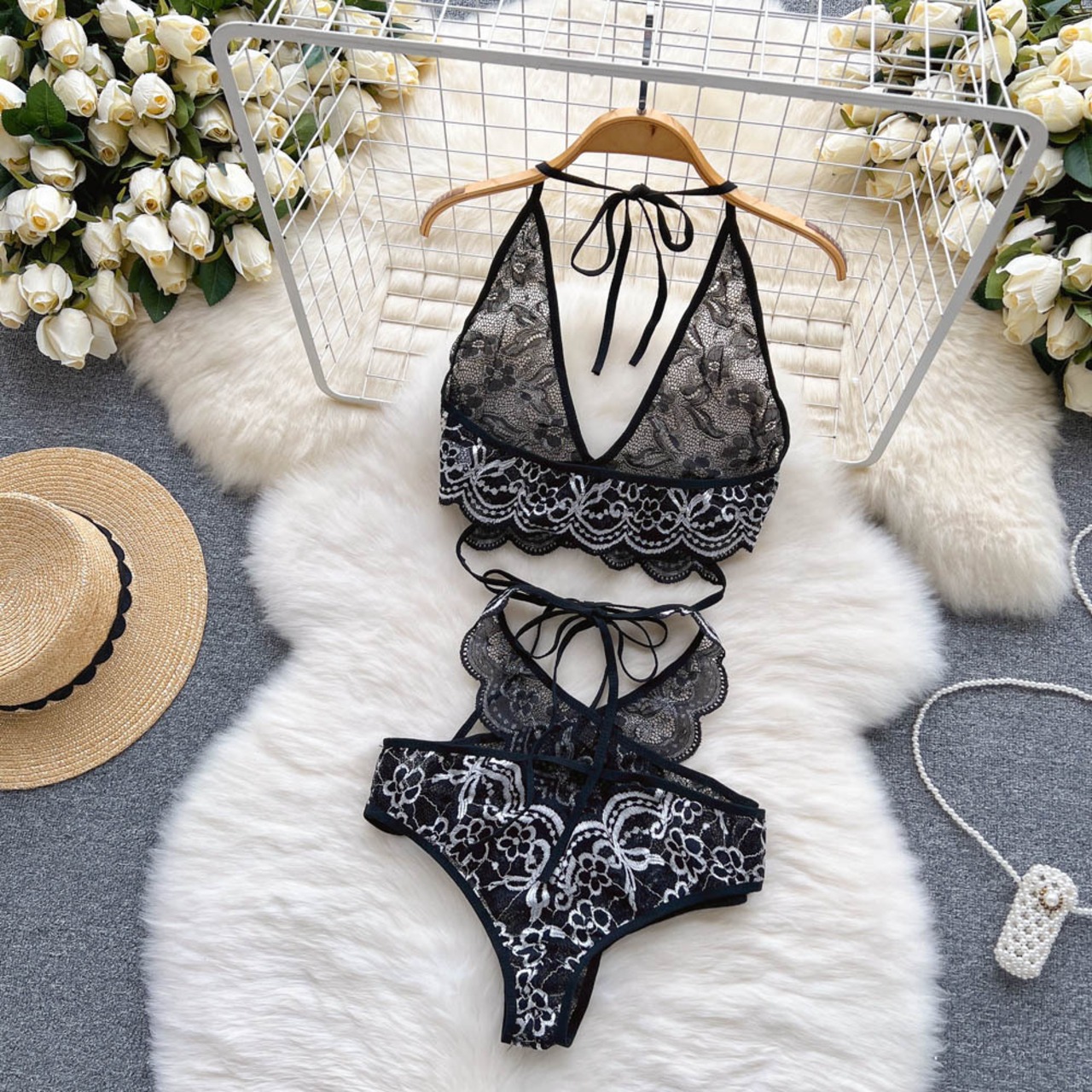 純情風 レース セクシー 吊り下げネック ノースチールリング 下着 レディース 夏 薄手 紐 ミッドウエスト ボトムス 下着 2点セット サマー 夏物 指輪 lyxaj44719458611