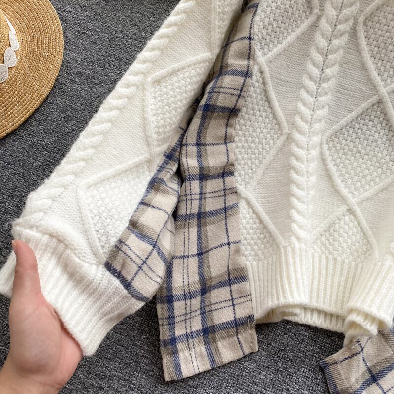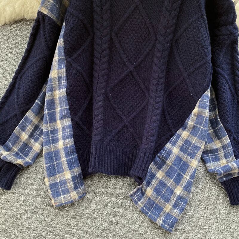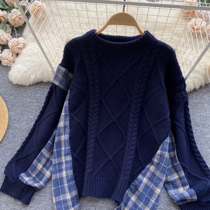 ステッチ チェック シャツ フェイク ツーピース ニット トップ レディース 秋冬 新バージョン ルーズ デザイン フィーリング レイジー ウィンド セーター オータム 秋物 ウィンター 冬物 lyxaj94790756214