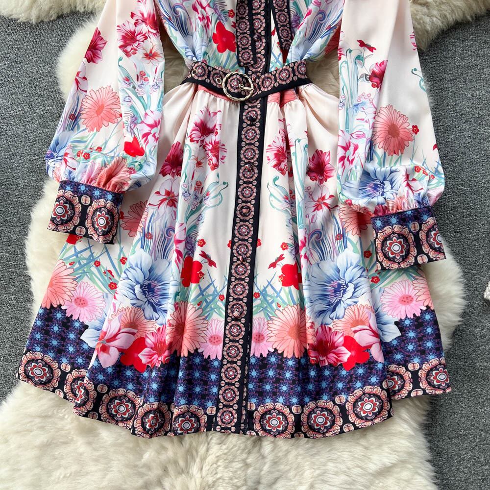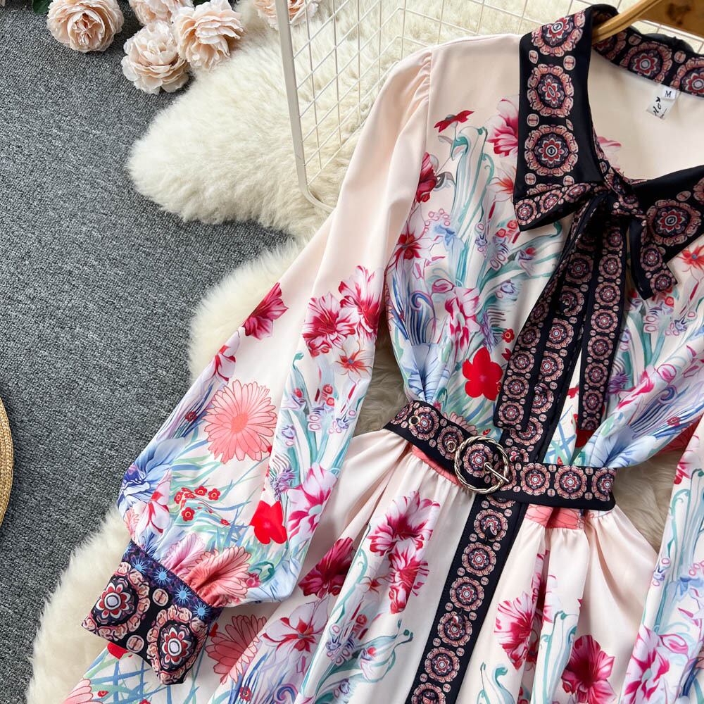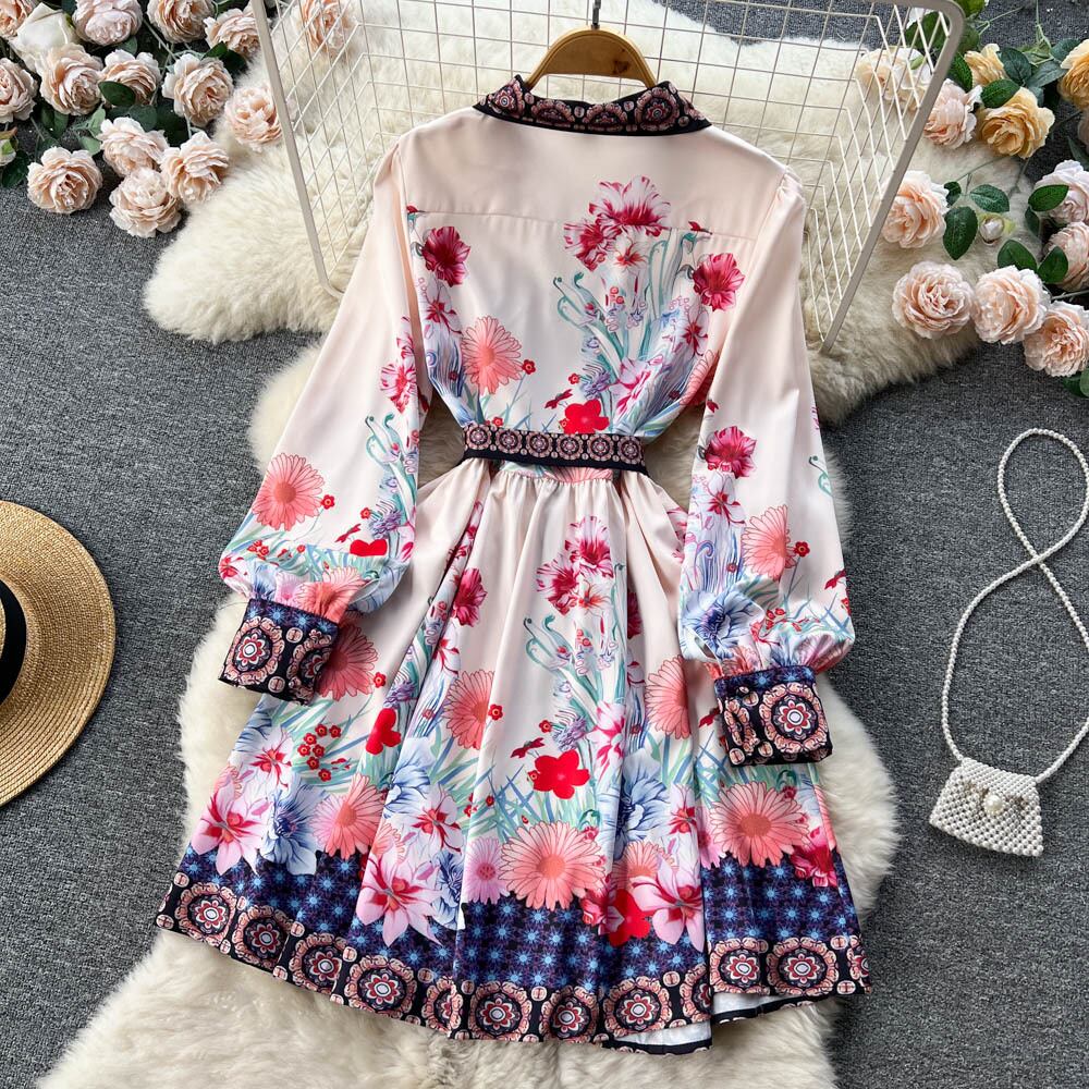 春の新しいラペルタイプリントレトロファッションヨーロッパとアメリカのパフスリーブドレス女性ハイウエスト eign スタイル A ラインスカート ハイウェスト スプリング 春物 Aライン ヨーロピアン lyxaj48757846896