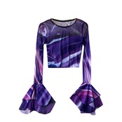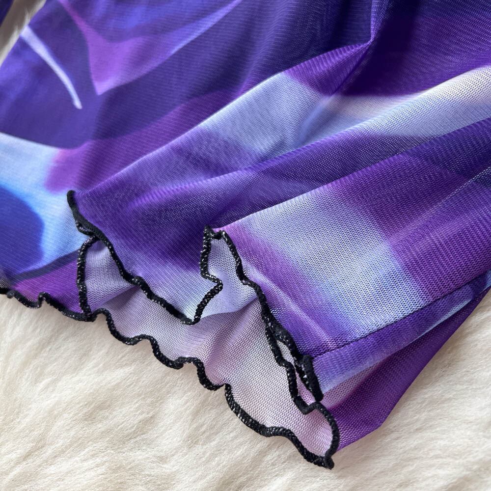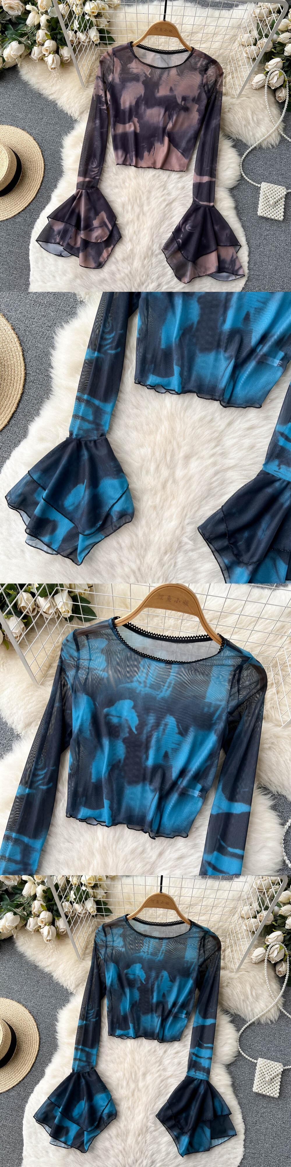 2023 春と夏の新デザインセンスフレンチファッションプリント Tシャツ女性トランペットスリーブショートセクションニッチメッシュトップ スプリング 春物 サマー 夏物 lyxaj76287430299