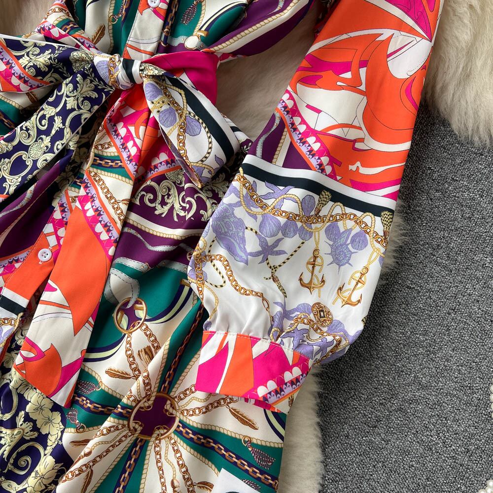 春と秋の新しいヨーロッパとアメリカのスタイルの個性的なファッション幾何学模様プリントAラインラペル長袖ラペルシャツドレス ロング スプリング 春物 オータム 秋物 ヨーロピアン lyxaj17416420755