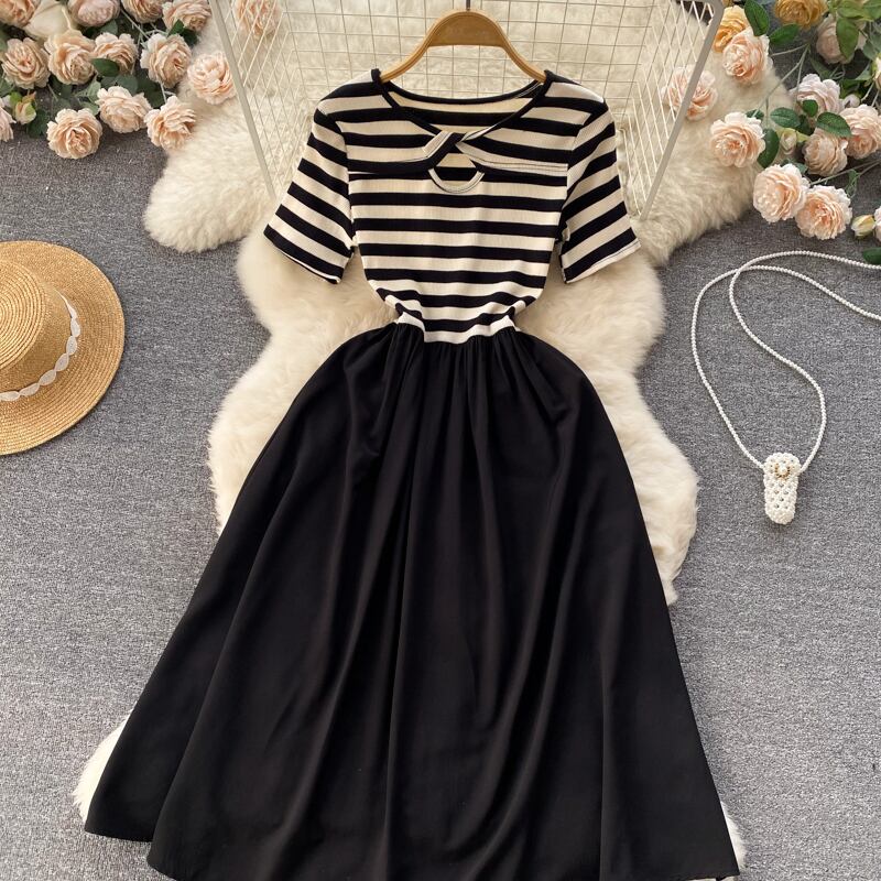 2023 夏の新しいスタイルのファッション中空デザイン半袖モザイク ストライプ フェイク ツーピース A ライン ドレス トレンド サマー 夏物 Aライン lyxaj45914334419