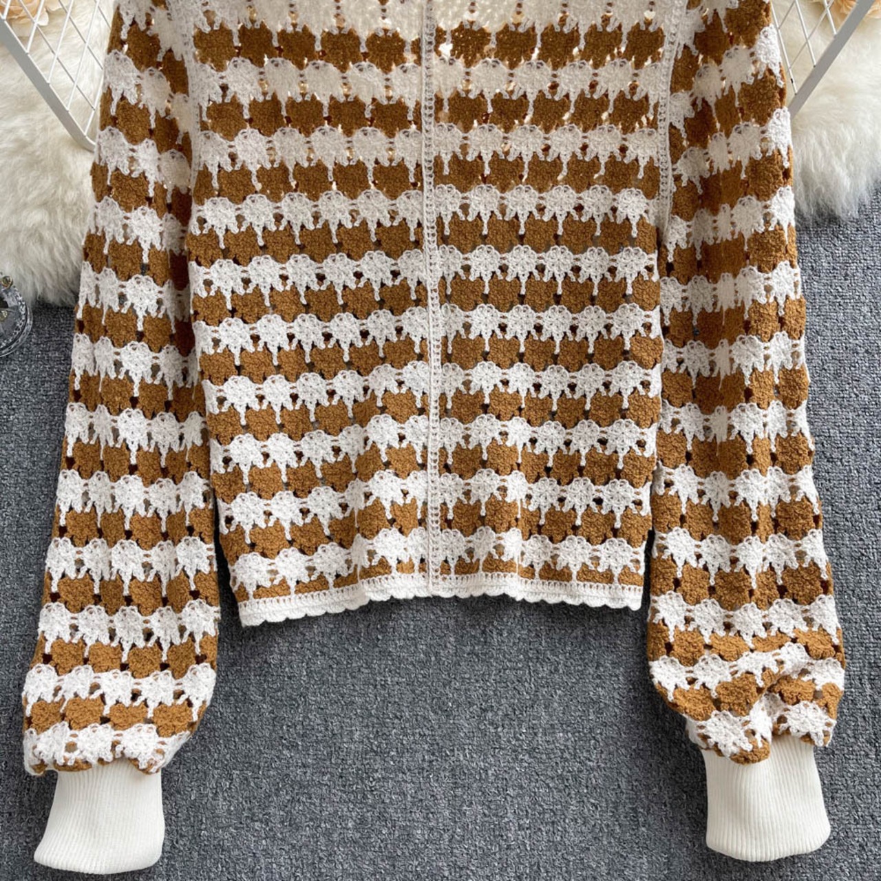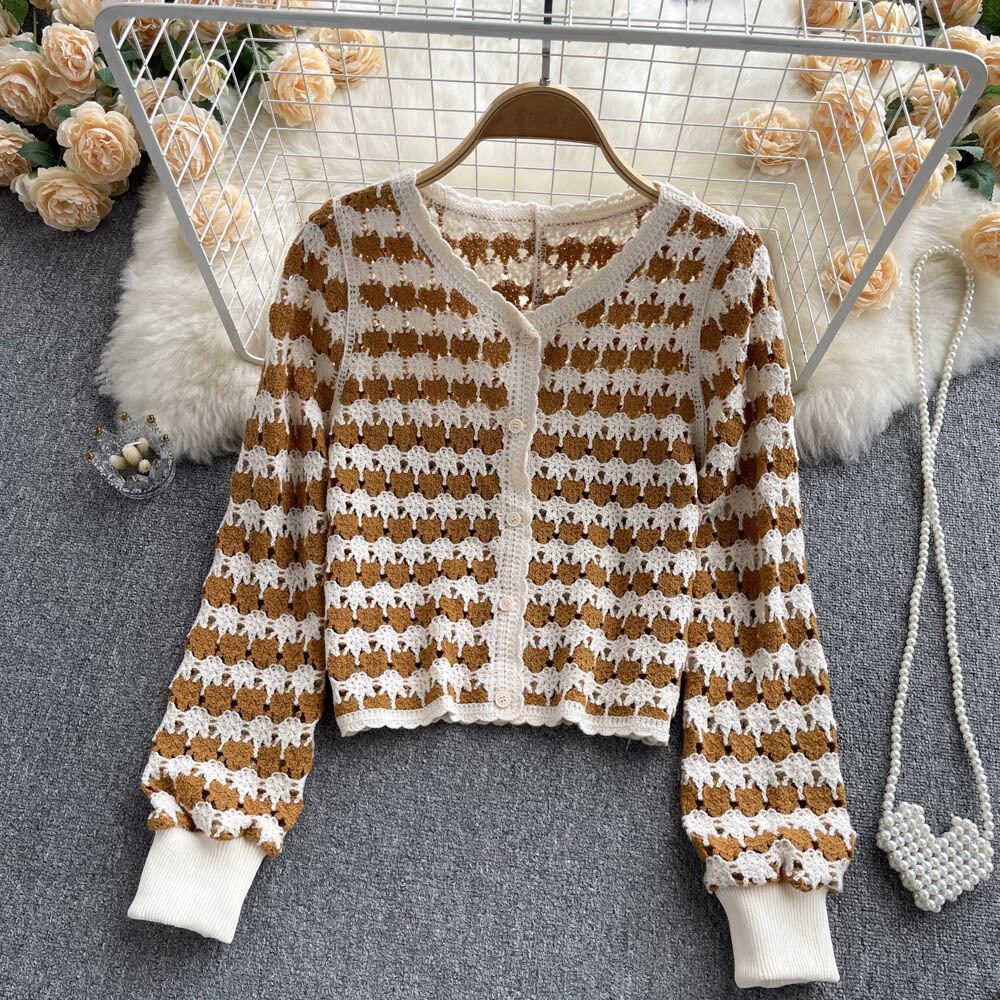 フレンチルーズクロシェカラーコントラストVネックニット日焼け止めカーディガンジャケットレディース薄手夏ルーズショート長袖トップス ロング サマー 夏物 lyxaj50873315710