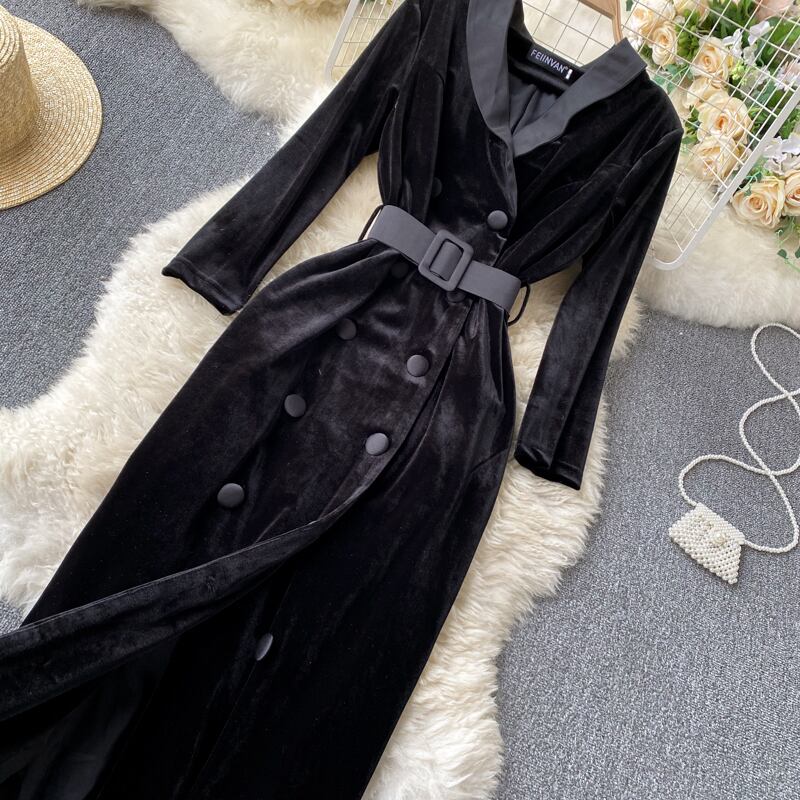 エンド気質長袖ドレス秋の女性のドレスウエスト痩身ベルベットヘップバーン風バッグヒップドレス ロング オータム 秋物 lyxaj59407939766