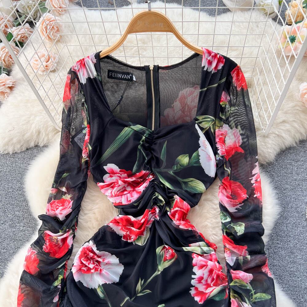春と秋の服ヨーロッパとアメリカのinsスタイルのファッションセクシーな長袖メッシュガーゼプリーツウエストバッグヒッププリントドレスロングスカート スプリング 春物 オータム 秋物 ヨーロピアン lyxaj86512095066