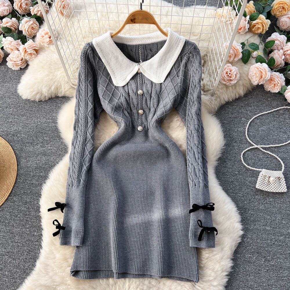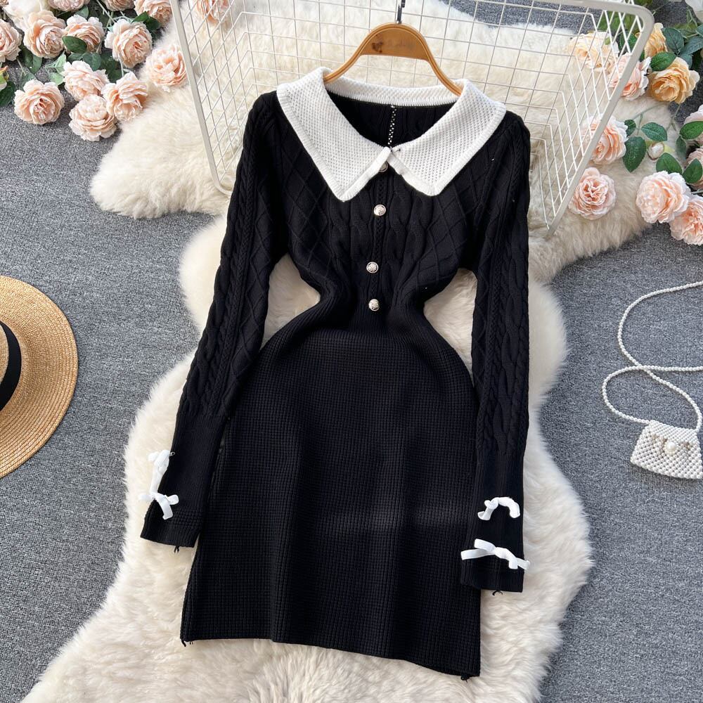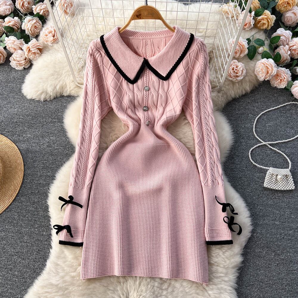 秋と冬のセクシーな甘いヒット カラー ニット ドレス女性ラペル バッグ ヒップ スカート純粋な欲望を着るセーター スカート トレンディ 大人ガーリー スウィート キュート カジュアル オータム 秋物 ウィンター 冬物 ピュア lyxaj54117423094