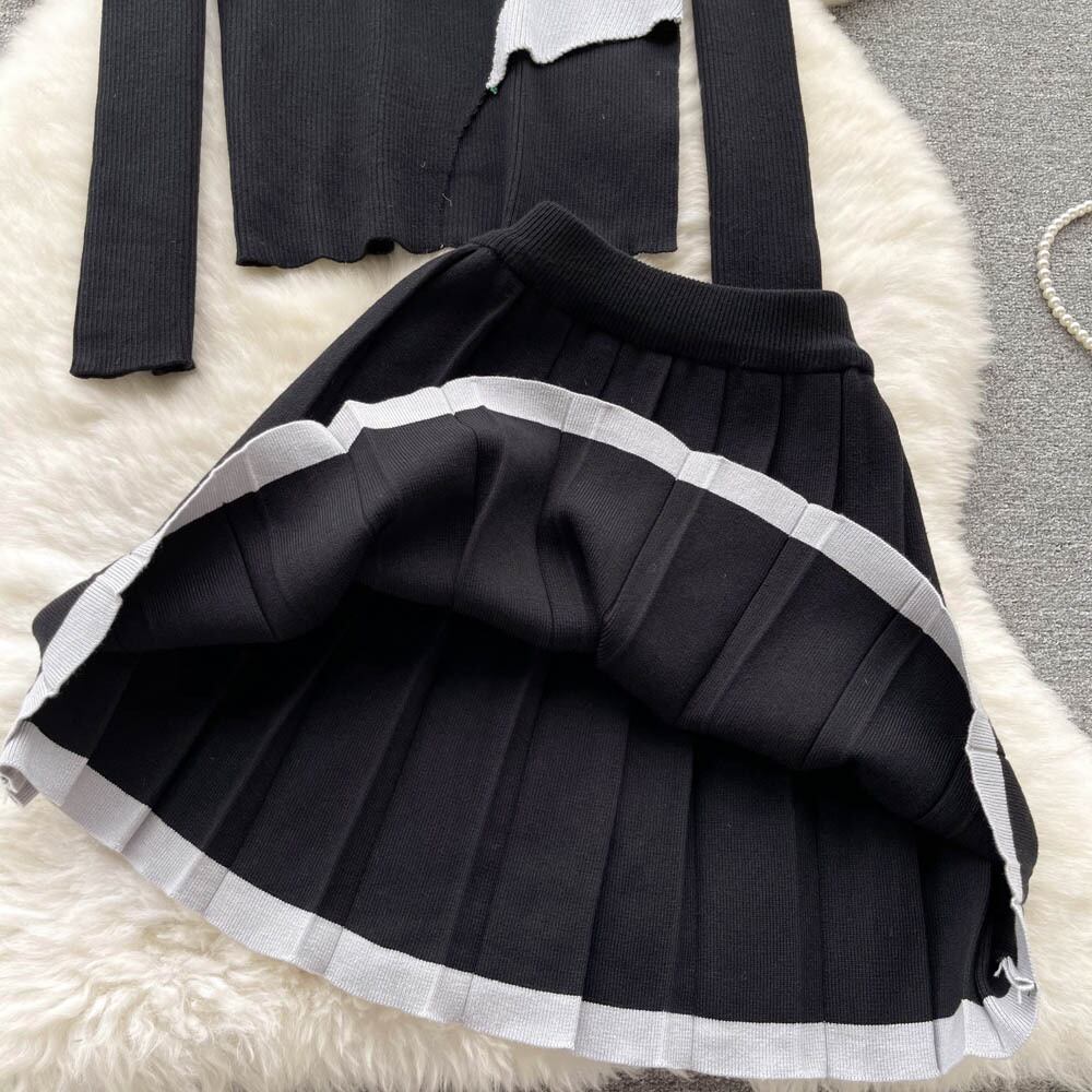 春秋新作配色洋式スーツレディース長袖ラウンドネックセーター+Aラインハーフ丈プリーツショートスカート2点セット ロング スプリング 春物 オータム 秋物 Oネック lyxaj86949381722