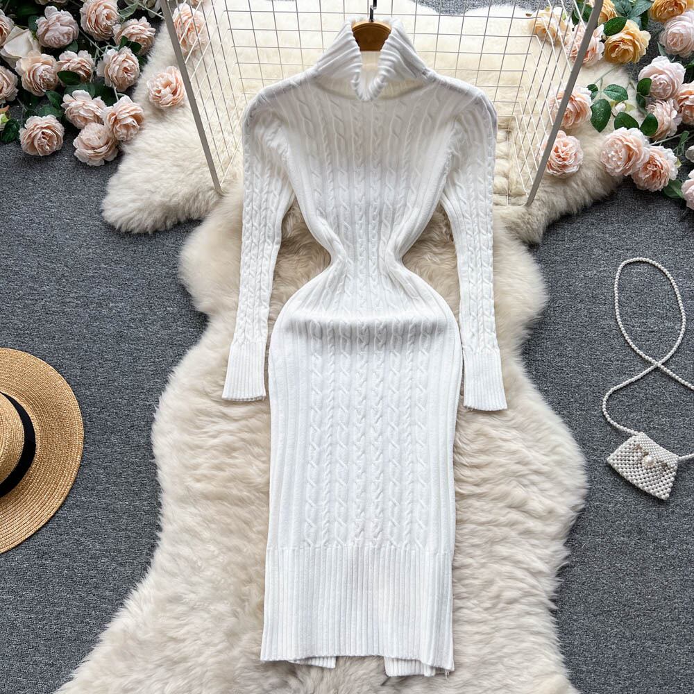 秋と冬の新しい気質のタートルネックのセータードレスの女性のプルオーバー長袖スリットツイストニットボトムス無地スカート ロング オータム 秋物 ウィンター 冬物 ソリッドカラー lyxaj63855528481