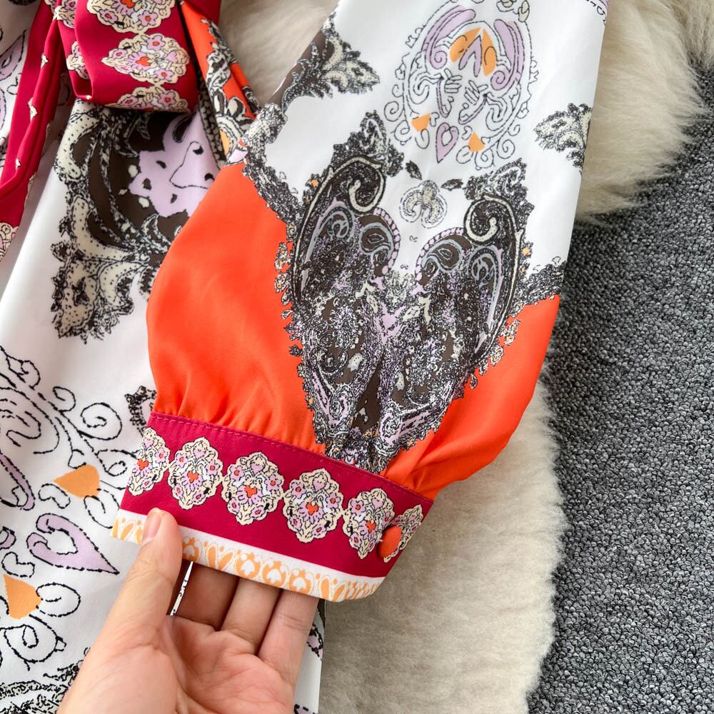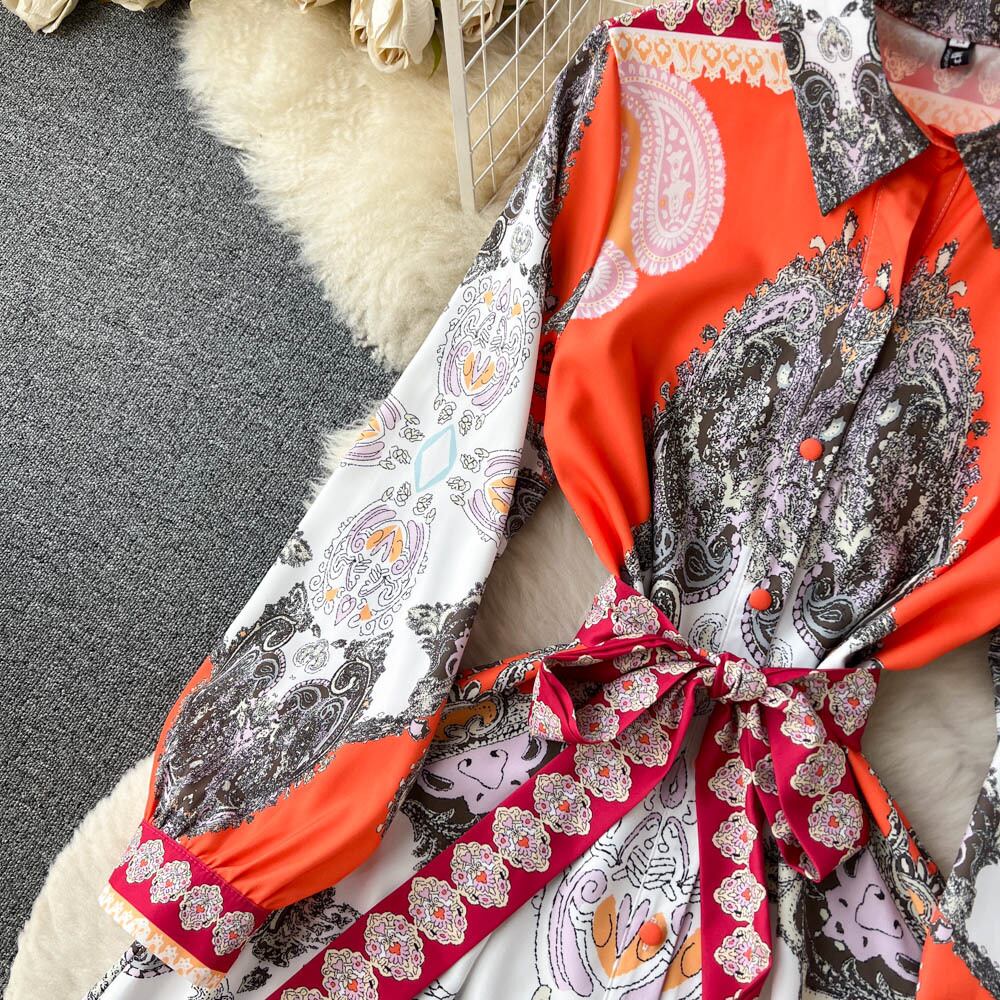 春の新しいレトロなコート スタイルの印刷ラペル シングル ブレスト ボタン ビッグ スイング ロング スカート女性弓フレンチ ドレス潮 リボン スプリング 春物 lyxaj42561004610