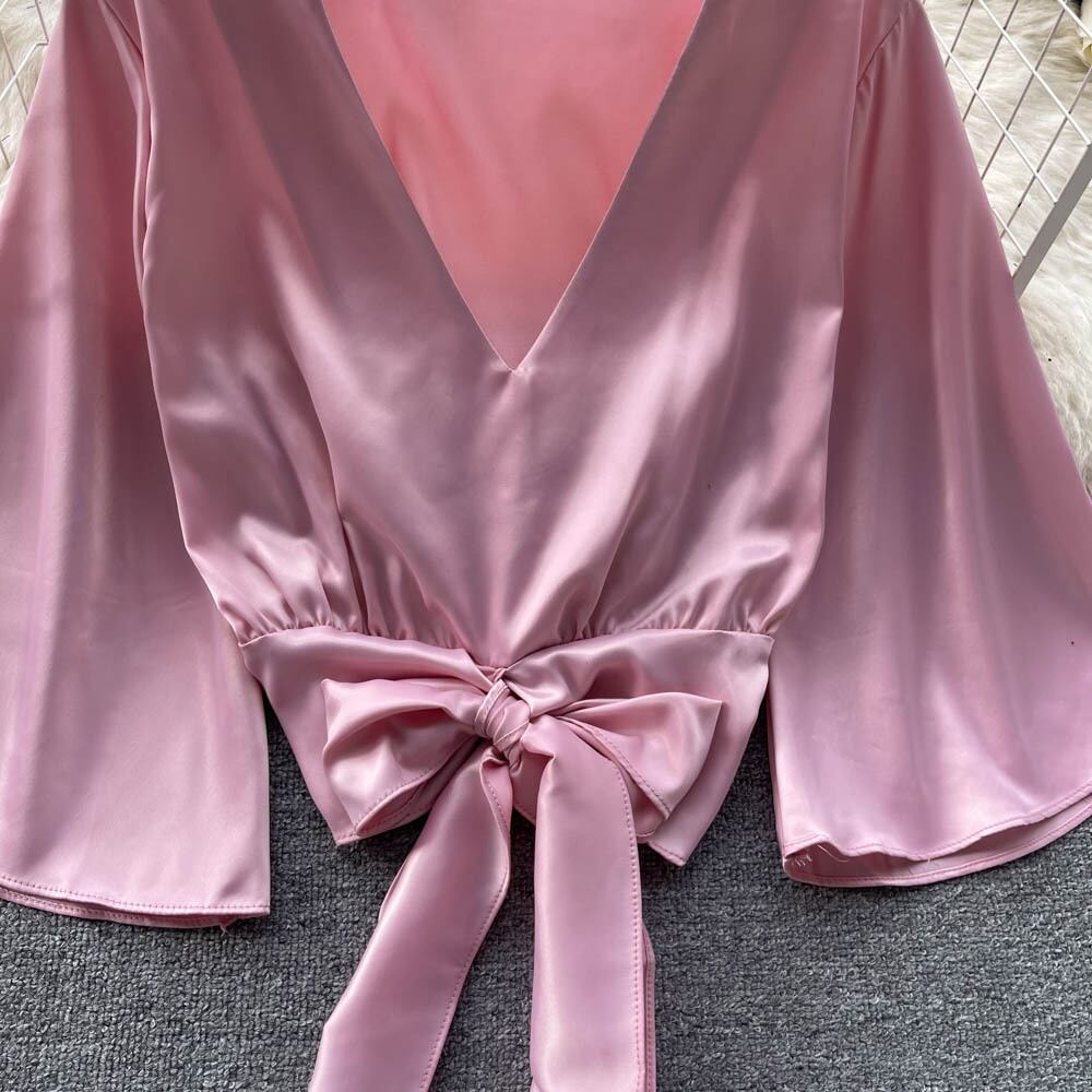 春と秋の新しい V ネック蝶ネクタイ緩いパフ スリーブ サテン シャツ女性の短いフレンチ スタイル トップ ショート リボン スプリング 春物 オータム 秋物 Vネック lyxaj15573420492