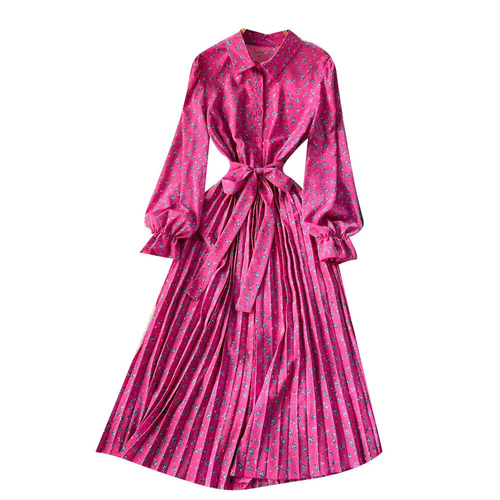 春の新しいスタイルのウエスト痩身ラペル花柄ドレス女性バージョンセレブエア長袖ビッグスイングプリーツロングスカート スプリング 春物 lyxaj63951333718