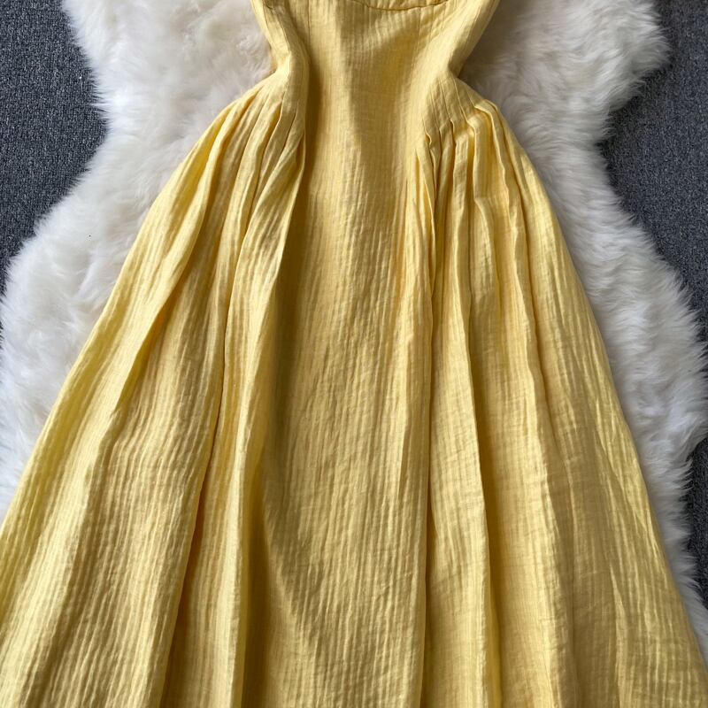 夏の優しいスタイルのレトロな黄色の腰のスリングドレスの女性の大きなスイングミドル丈の初恋の妖精のスカート サマー 夏物 lyxaj28168237551