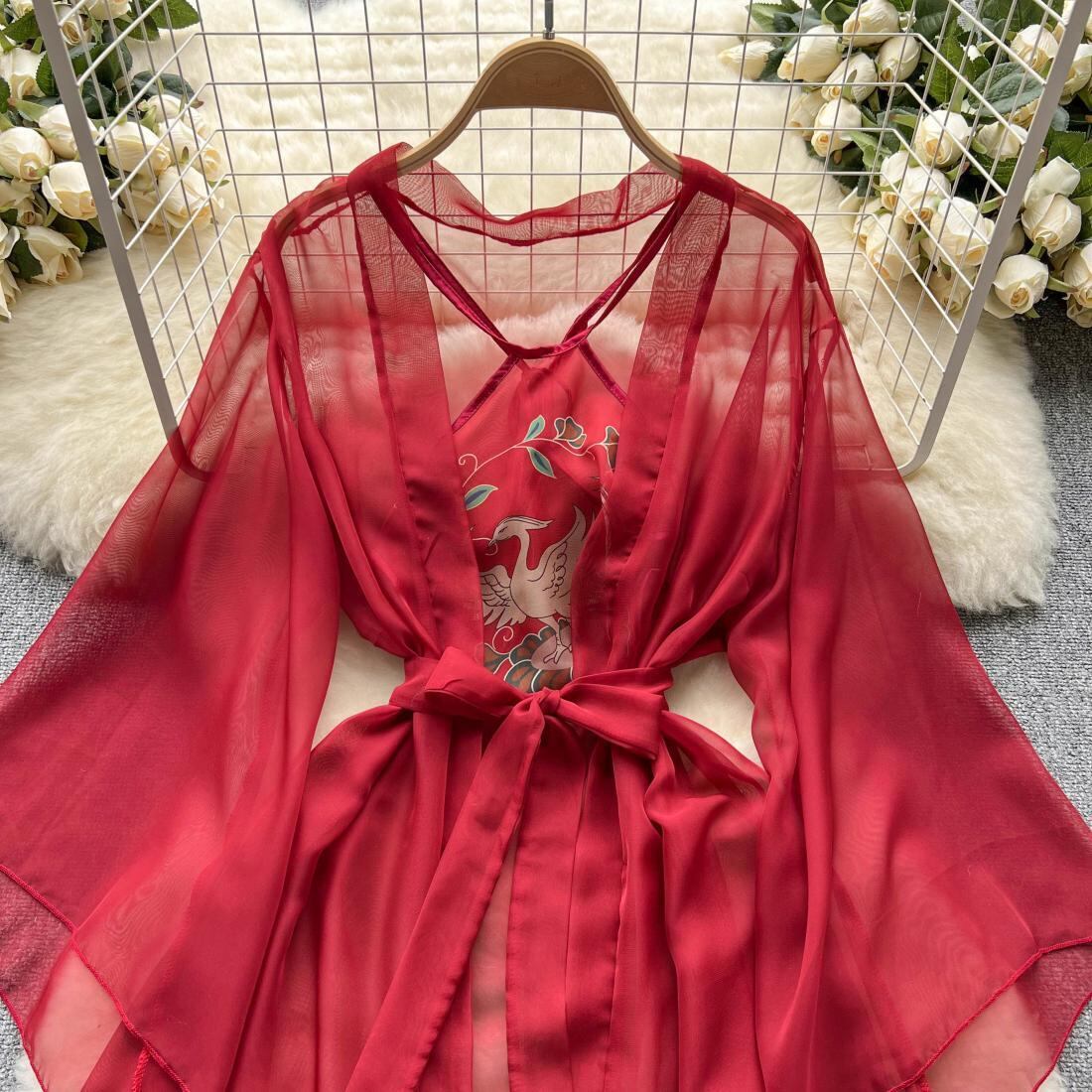 春と夏の新しいセクシーなベイビーハンギングネックプリントチューブトップメッシュナショナルスタイルの新しい中国風の緩い怠惰なロングスーツ潮 スプリング 春物 サマー 夏物 lyxaj64001579191