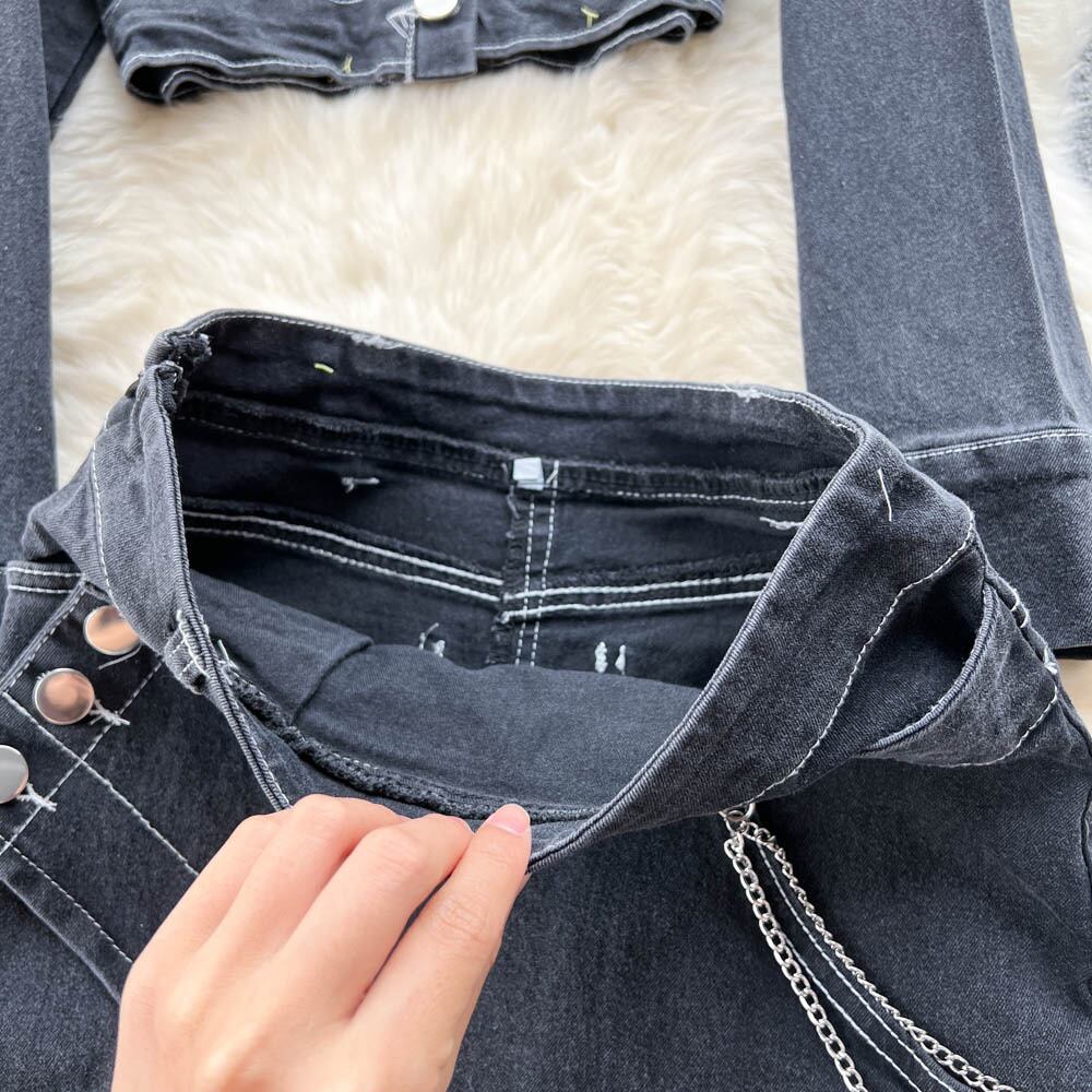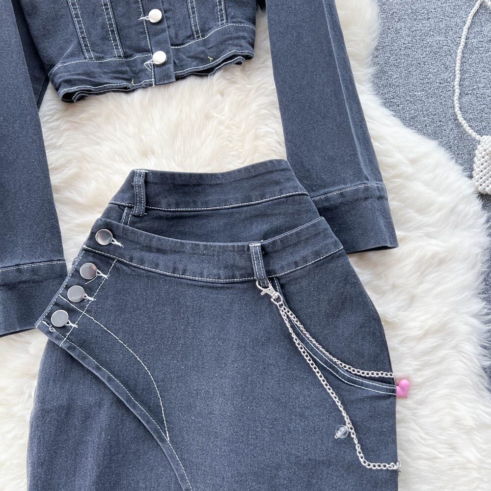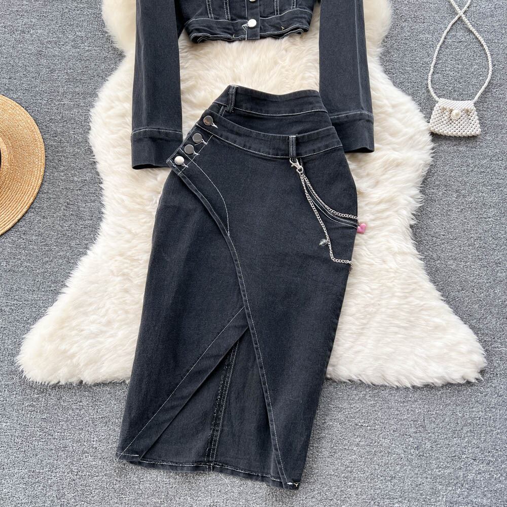 香港風レトロツーピーススーツ秋デニム長袖シャツトップハイウエストスリムスリットバッグヒップドレス婦人服 ハイウェスト ロング オータム 秋物 lyxaj61476439639