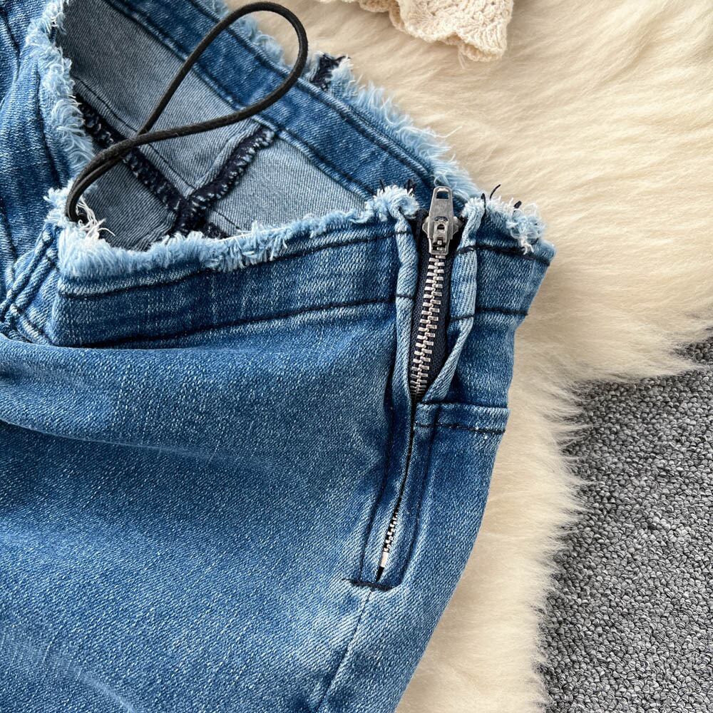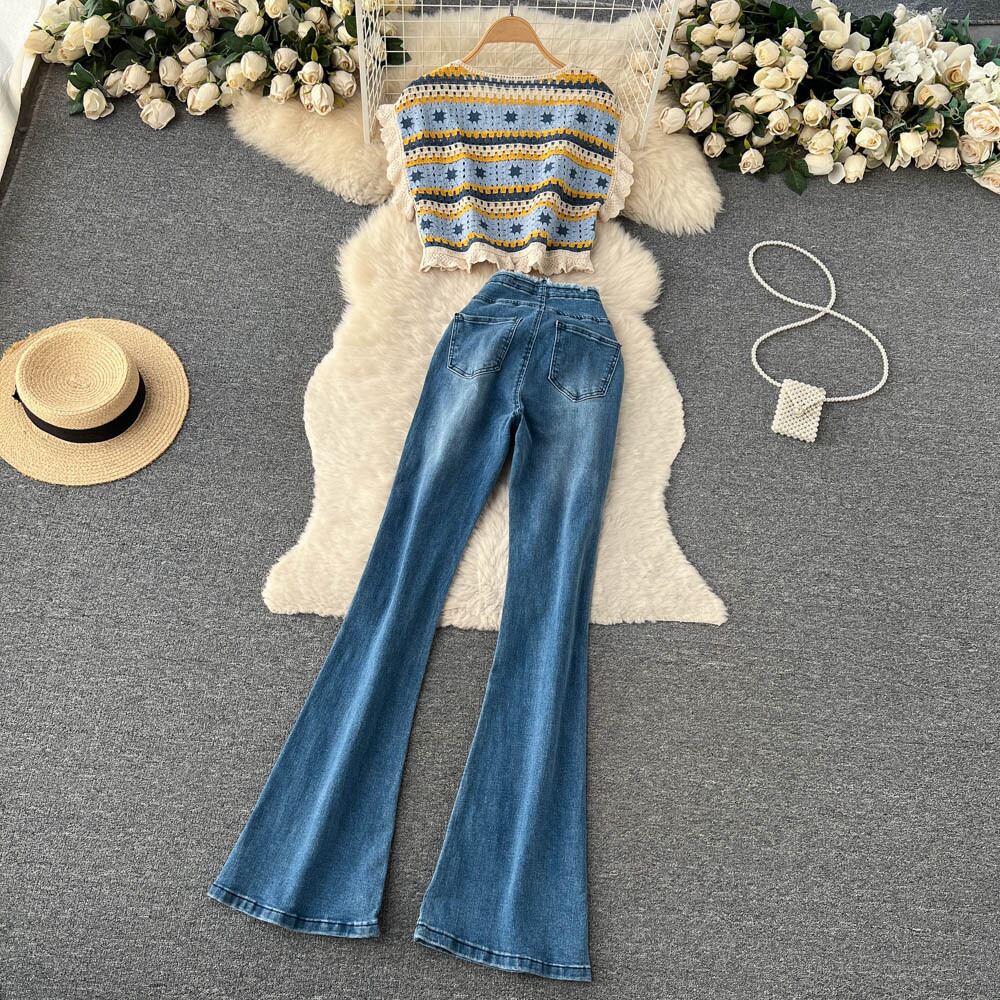 春夏レトロスーツニッチホックフラワーホローレースエッジショートトップハイウエストデニムフレアパンツ2点セット ハイウェスト レッド スプリング 春物 サマー 夏物 フラワーデザイン lyxaj21388688922
