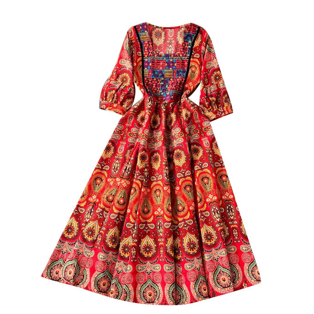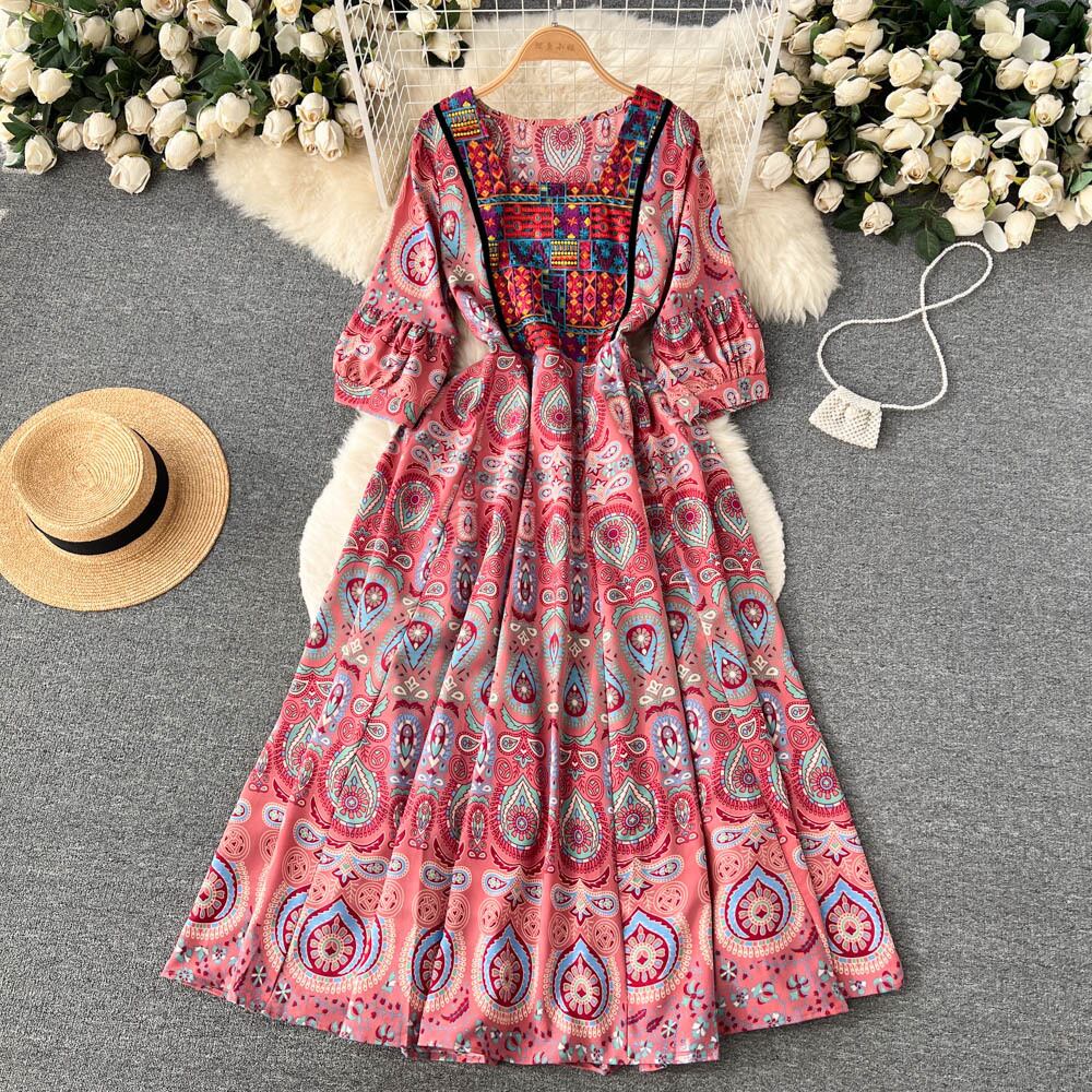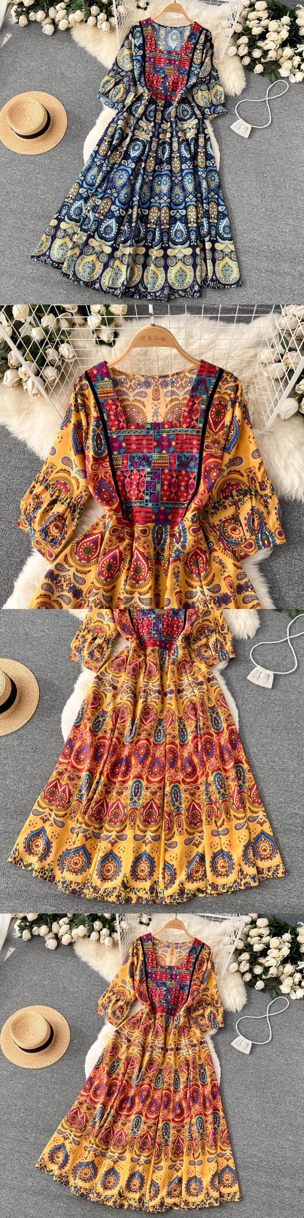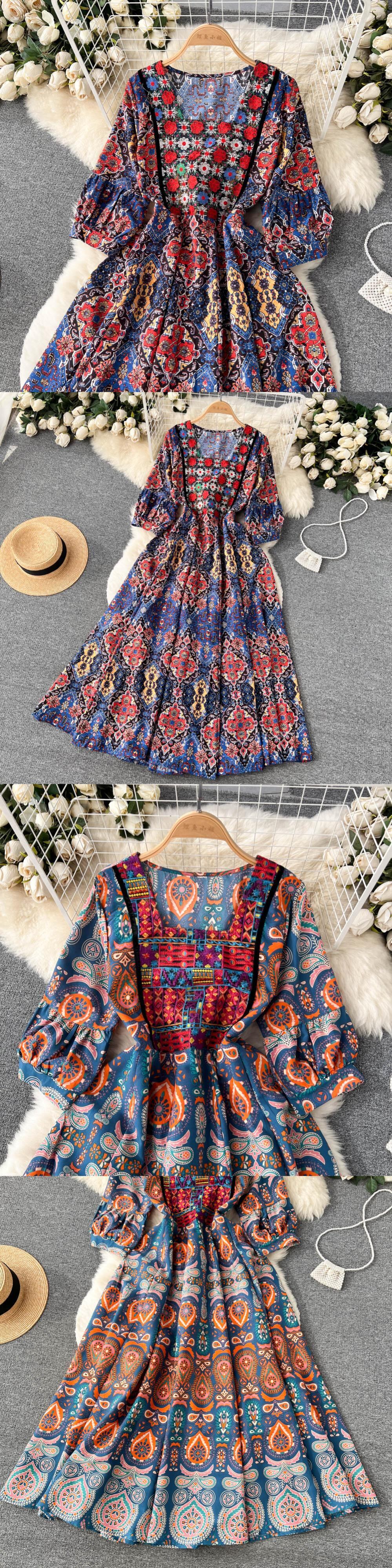 春夏秋冬 エスニック風 プリント 刺繍 スクエアカラーワンピース レディース ウエストウエスト大振り プリーツ Aライン ゆったり ロングスカート スプリング 春物 サマー 夏物 スクウェア lyxaj98558954201