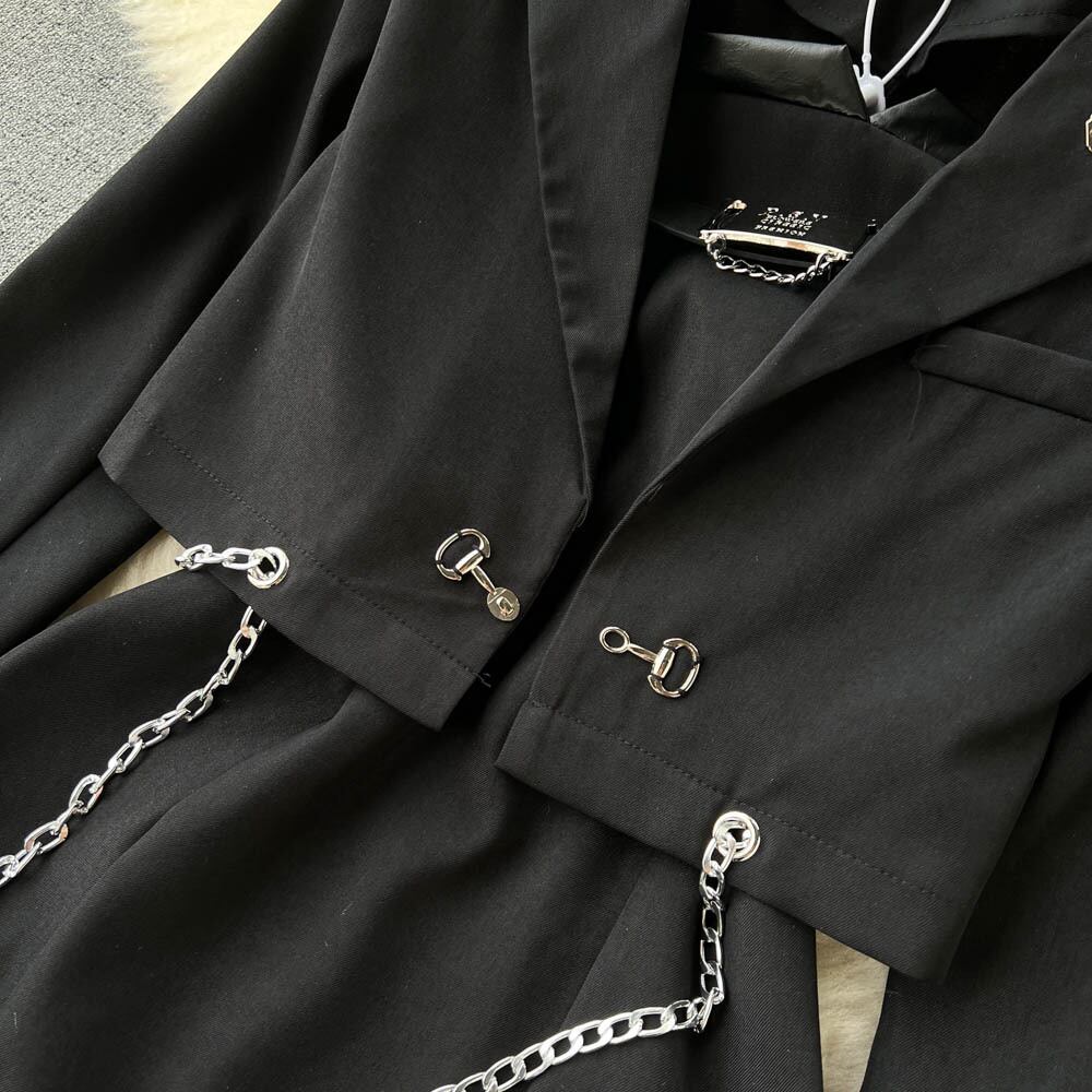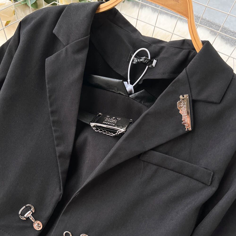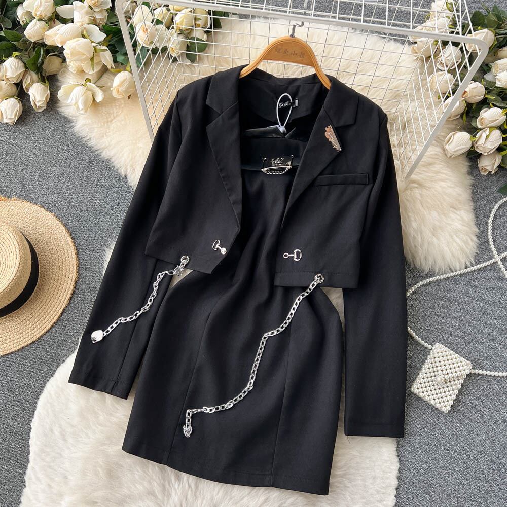 黒の秋のスーツの女性のハイエンド感ショートスモールスーツジャケット+ヒップストラップサスペンダードレス2点セット ブラック オータム 秋物 lyxaj52086399928