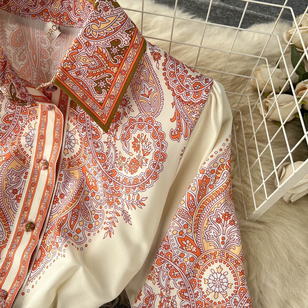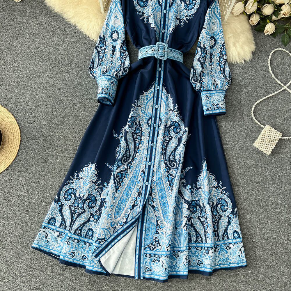 春と秋のヨーロッパとアメリカのインレトロなスタンドカラーのランタンパフスリーブプリントドレスの女性の腰と大きなスイングオーバーザニーロングスカート スプリング 春物 オータム 秋物 ヨーロピアン lyxaj51931282179