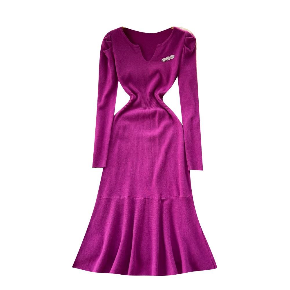 気質女神ファン V ネック秋のドレスの女性のフレンチ ウエスト痩身フリル長袖バッグ ヒップ ロング スカート オータム 秋物 Vネック lyxaj81606799328