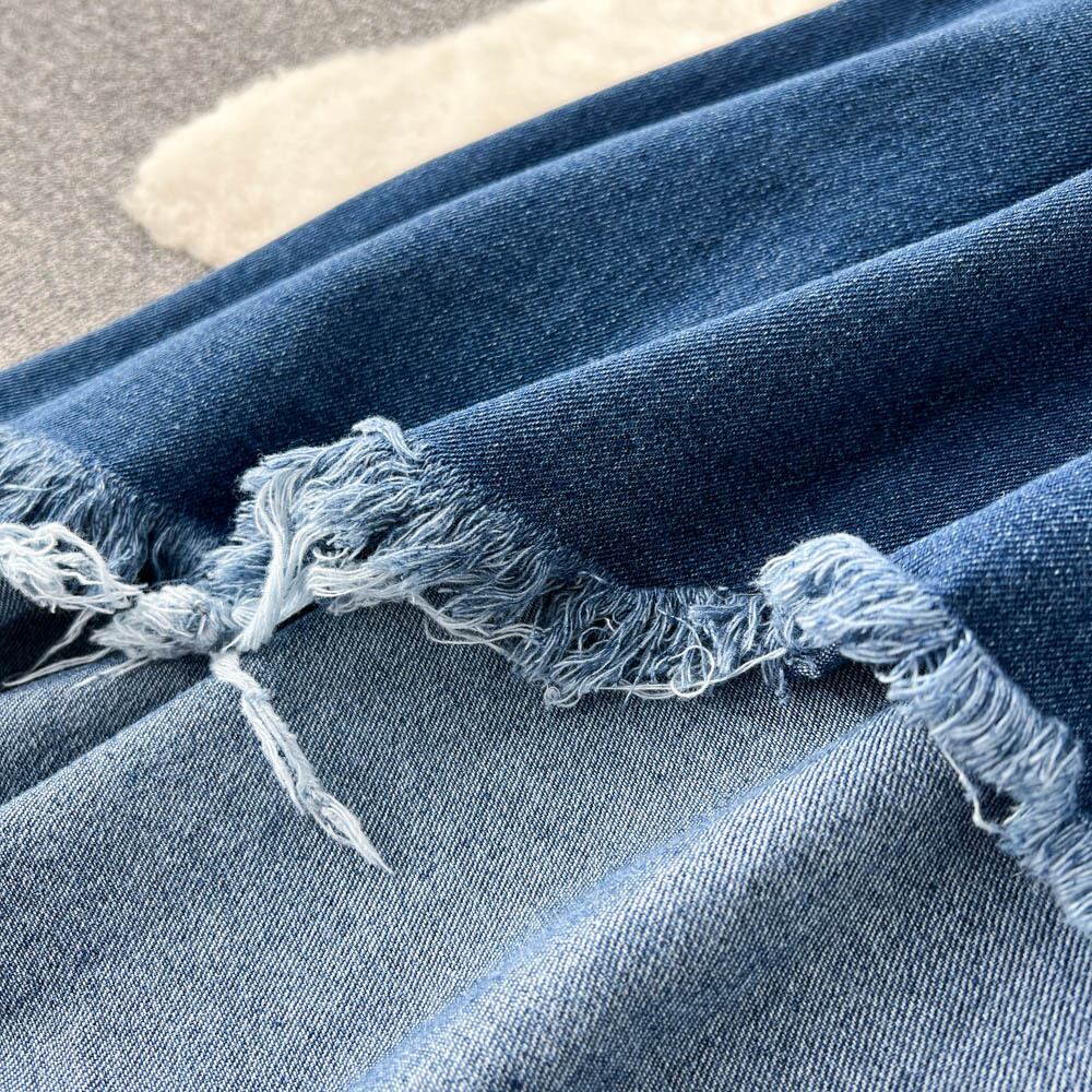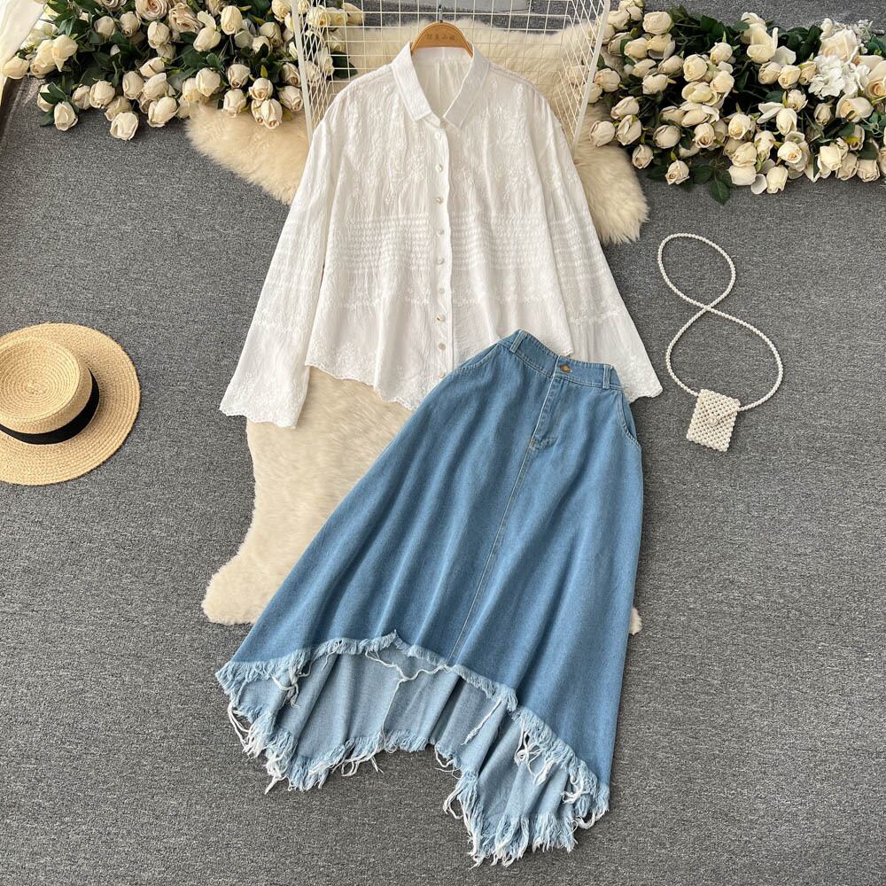 春ワンピースラペルフックフラワー刺繍ホワイトシフォントップイレギュラー大振りハイウエストデニムスカートツーピーススーツ ハイウェスト スプリング 春物 フラワーデザイン lyxaj86121726259