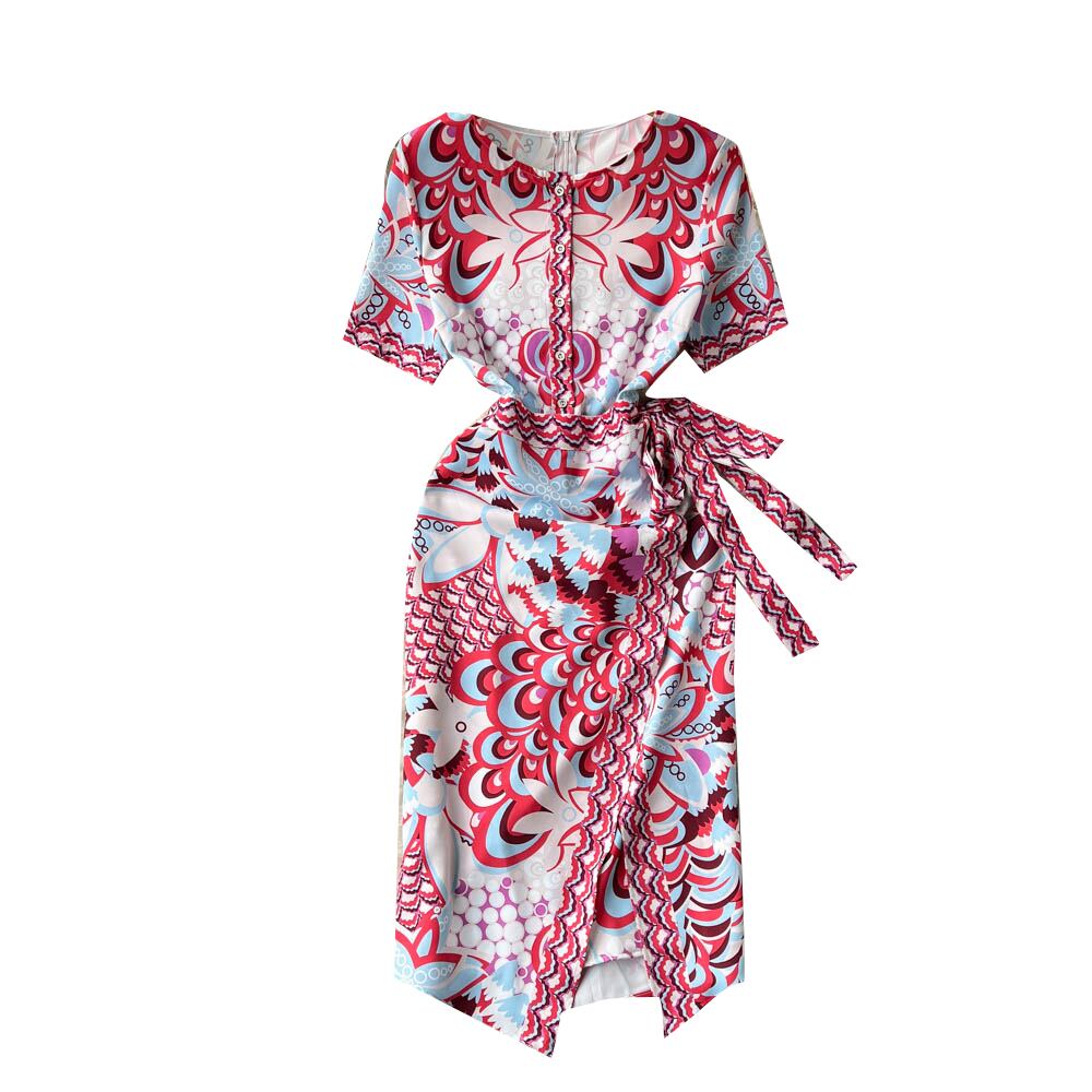 夏ラウンドネック半袖プリントドレス女性ヨーロッパとアメリカのレトロな個性不規則なスリットウエストバッグヒップスカートトレンディ サマー 夏物 Oネック ヨーロピアン lyxaj27045436105