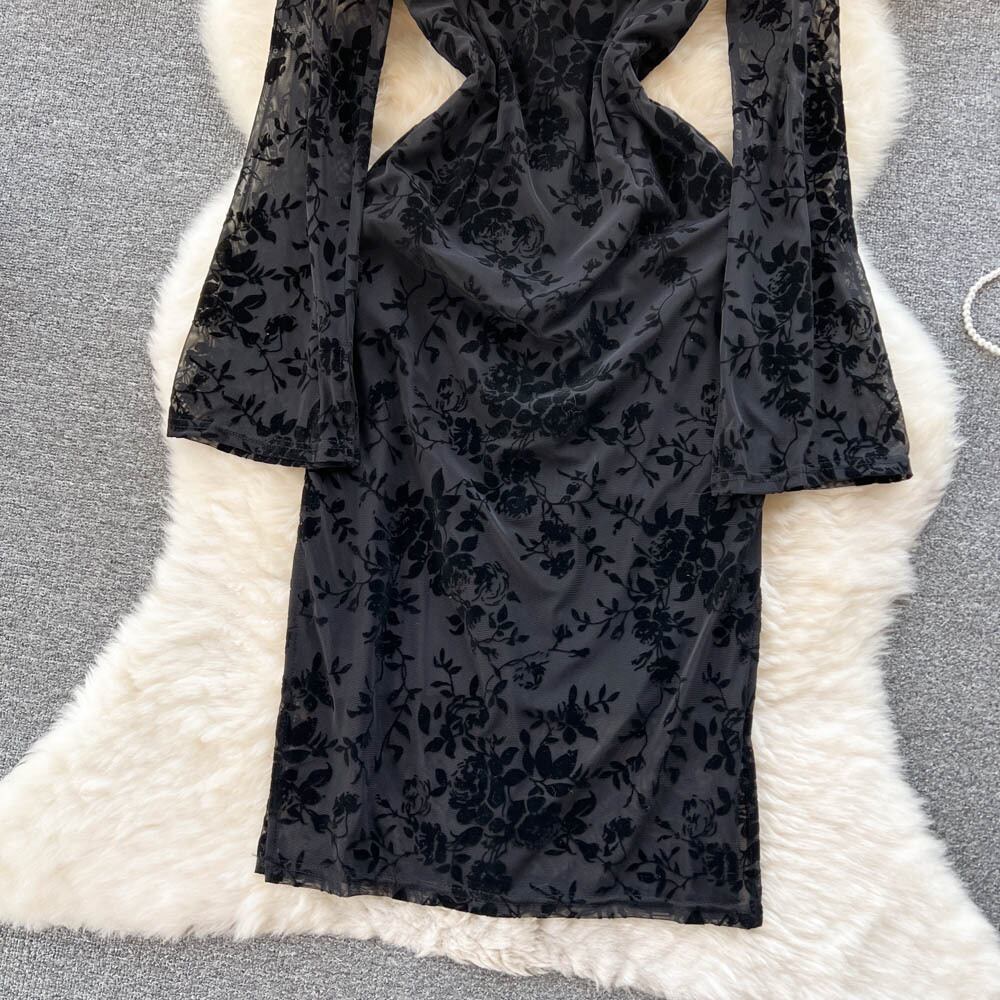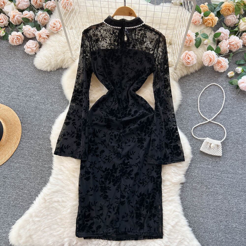 秋と冬の新しいライトおなじみのスタイルのレトロなセクシーな気質長袖中空メッシュ レース チャイナ バッグ ヒップ有名人のドレス ロング オータム 秋物 ウィンター 冬物 lyxaj10141829415