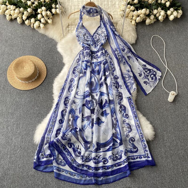 フレンチハンギングネックストラップレスバックレスVネックノースリーブイン風シフォンプリントホリデードレスレディースビッグスイングオーバーニーロングスカート lyxaj73723838611