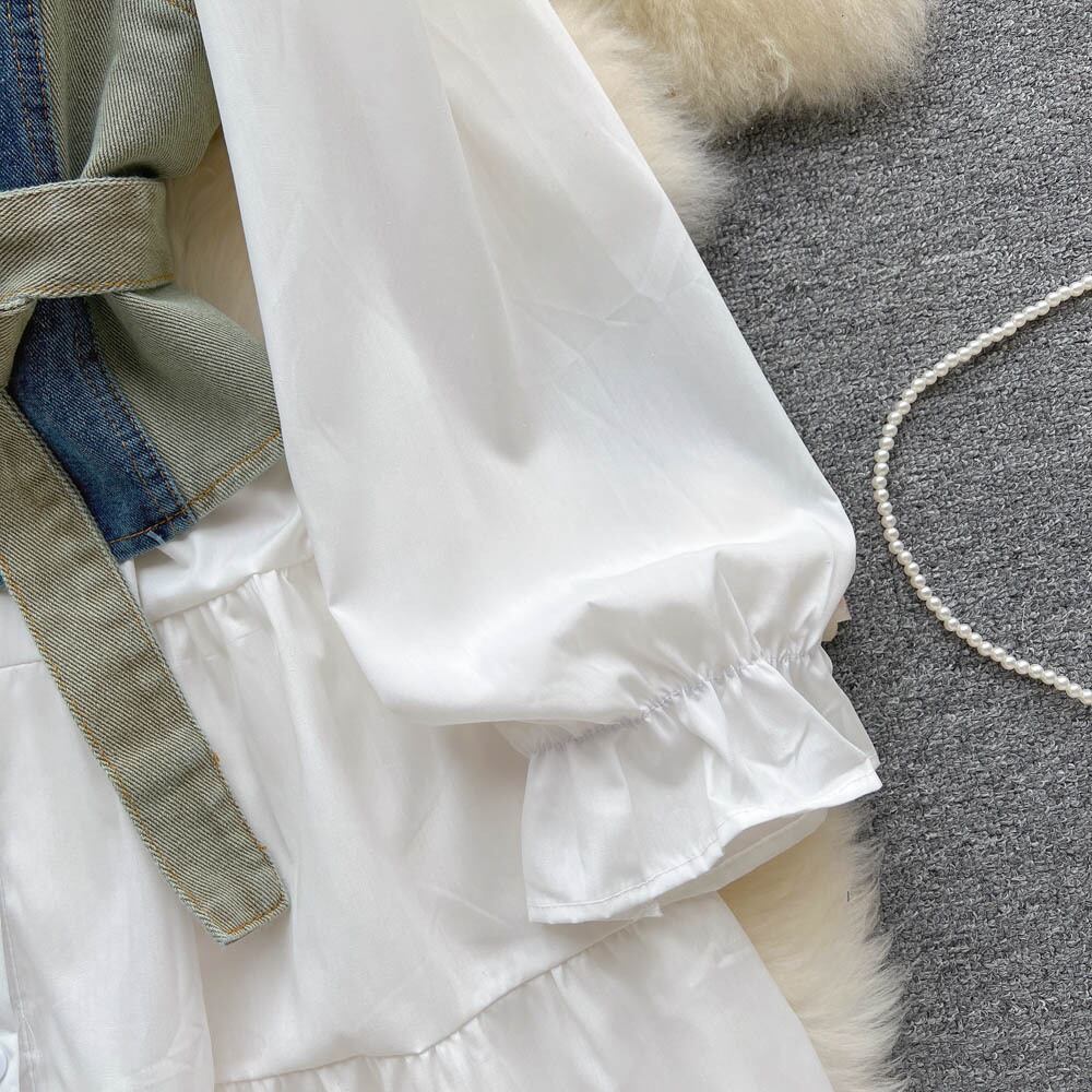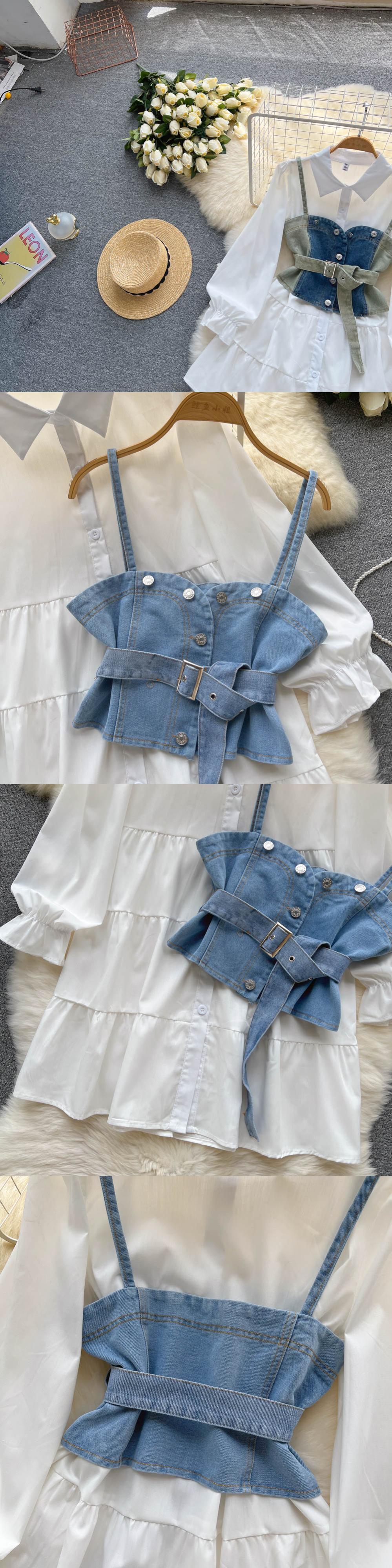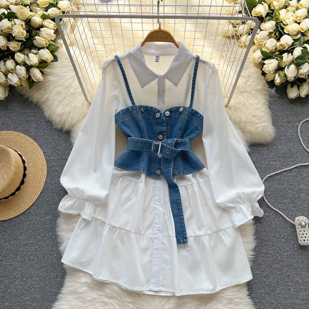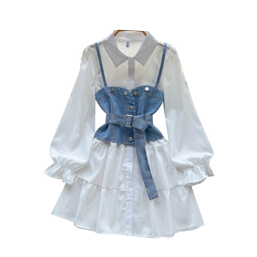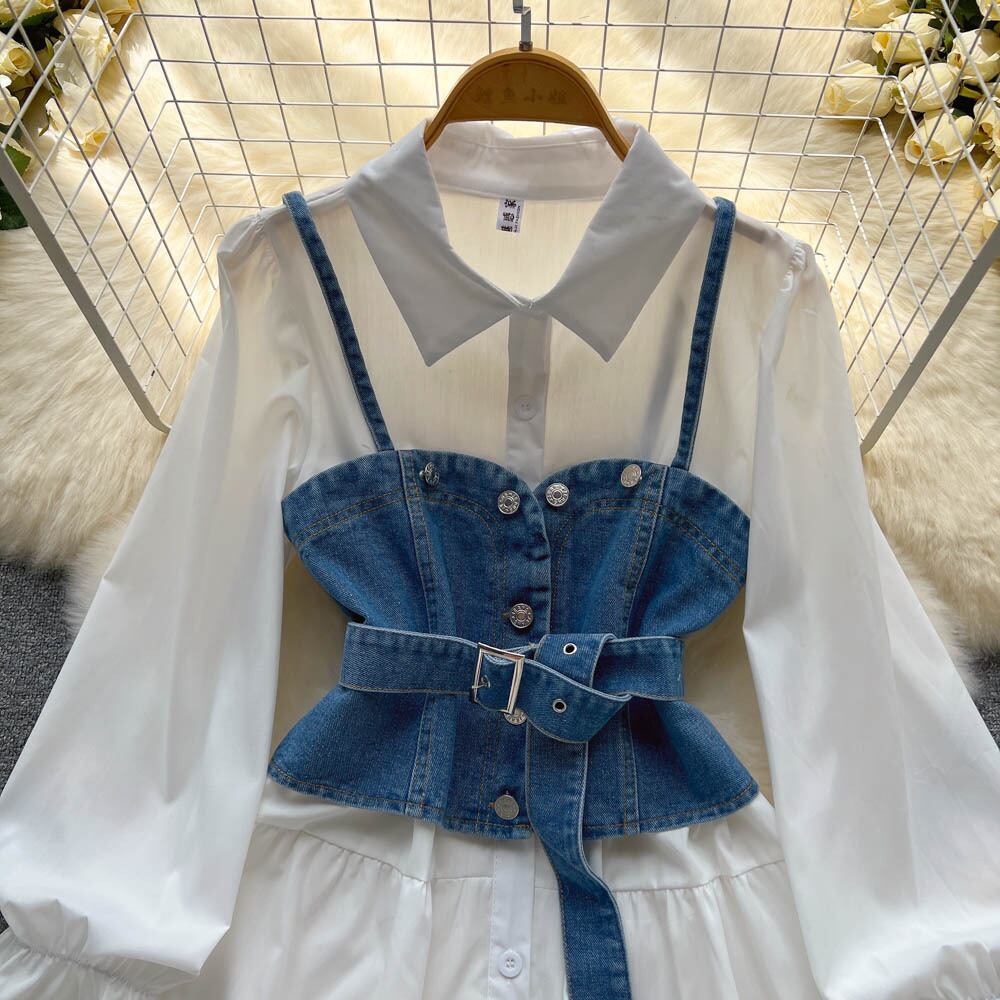 -高品質の軽くて成熟した気質の長袖のドレス、夏の女性の白いシャツのスカート、デニムの小さなサスペンダーのスーツ ロング ホワイト サマー 夏物 lyxaj49998766671