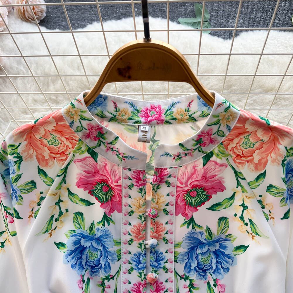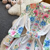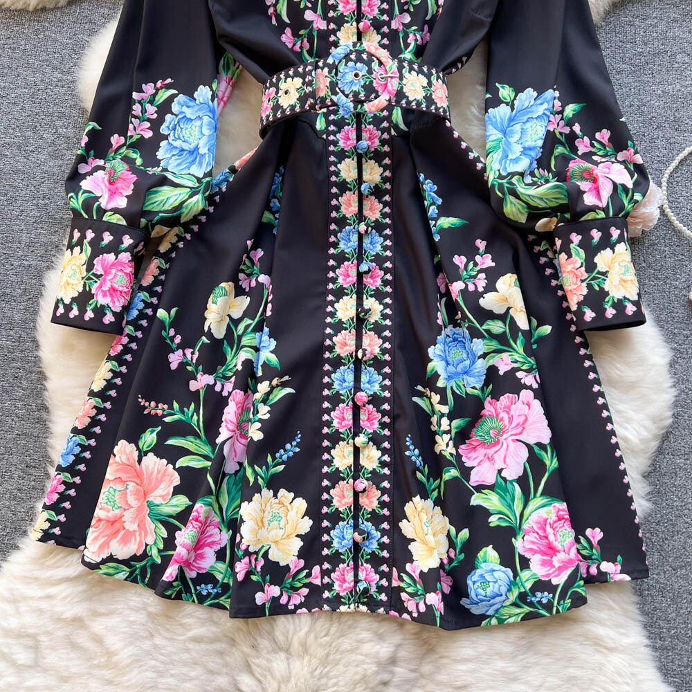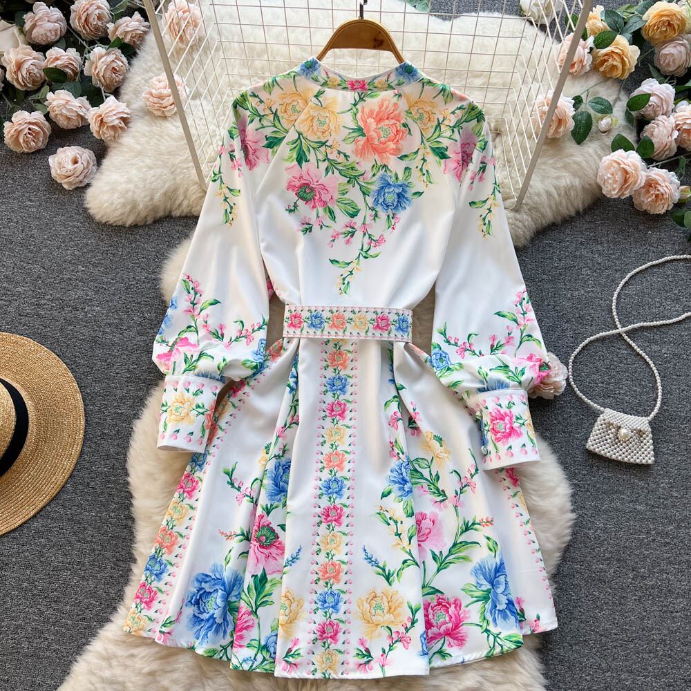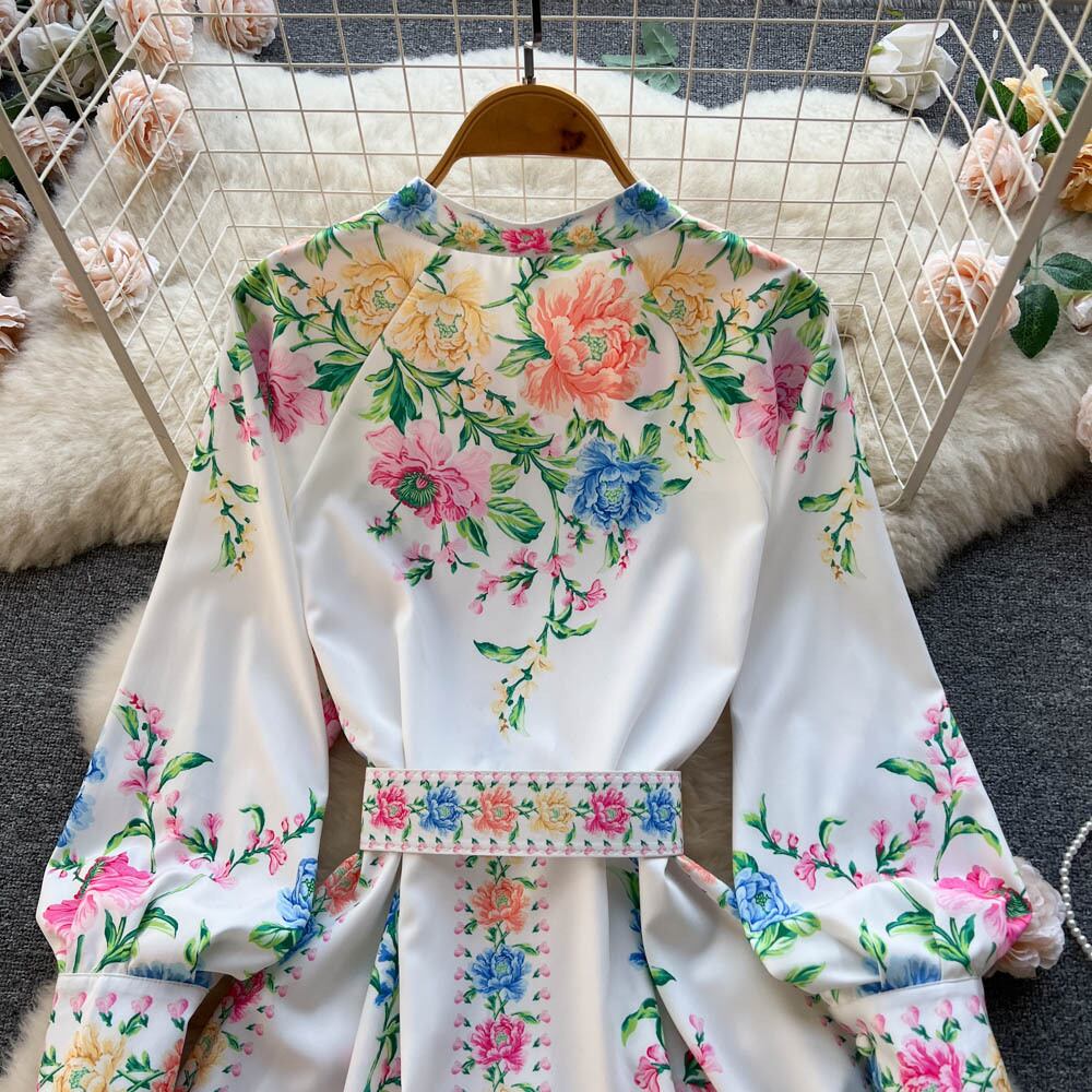 春の新作レトロパレススタイルスタンドカラーシングルブレストロングスリーブウエストスリミングミッドレングススウィートプリントドレス レース 大人ガーリー キュート カジュアル スプリング 春物 lyxaj3742160264