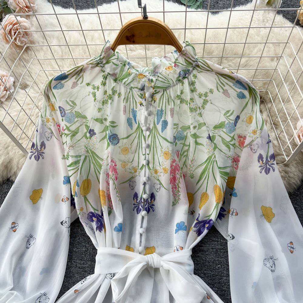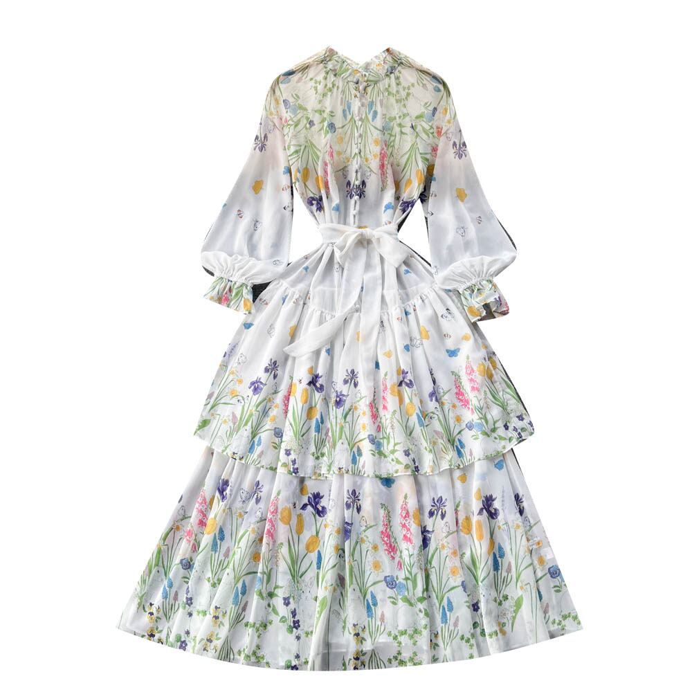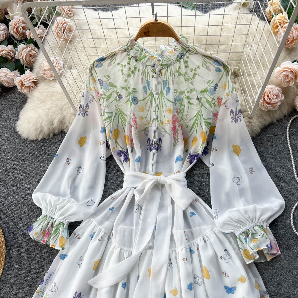 春夏新作パフスリーブフリルプリントウエストウッド耳サイドケーキドレス女性妖精花柄ドレス ラッフル スプリング 春物 サマー 夏物 lyxaj83246568985