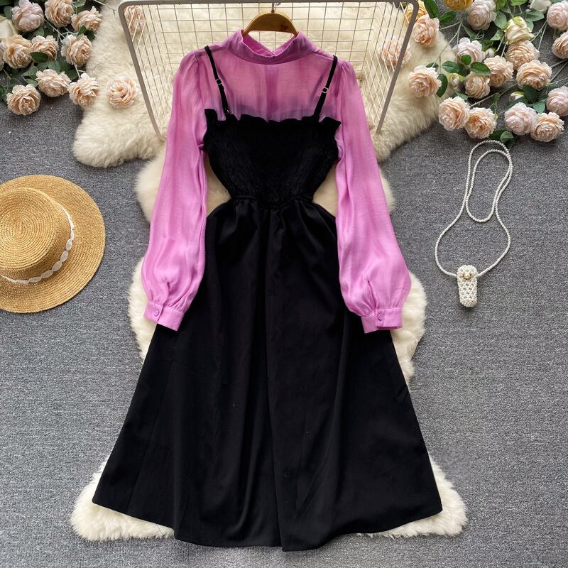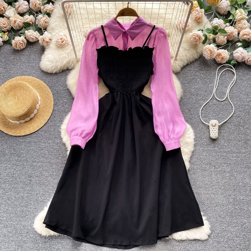 2023 春の新スタイル小さな香りフェイクツーピースシャツドレス女性の長袖ウエストウエストビッグスイング A ラインロングスカートトレンディ スプリング 春物 Aライン lyxaj95657496380