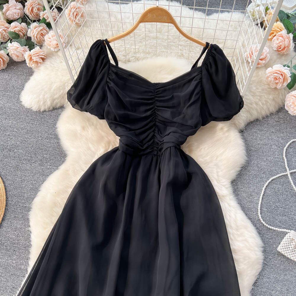 夏の新バージョンのバブル半袖ピュアデザイア風のスクエアカラードレスフェミニンなプリーツAラインシフォンロングスカート サマー 夏物 スクウェア lyxaj25842156880