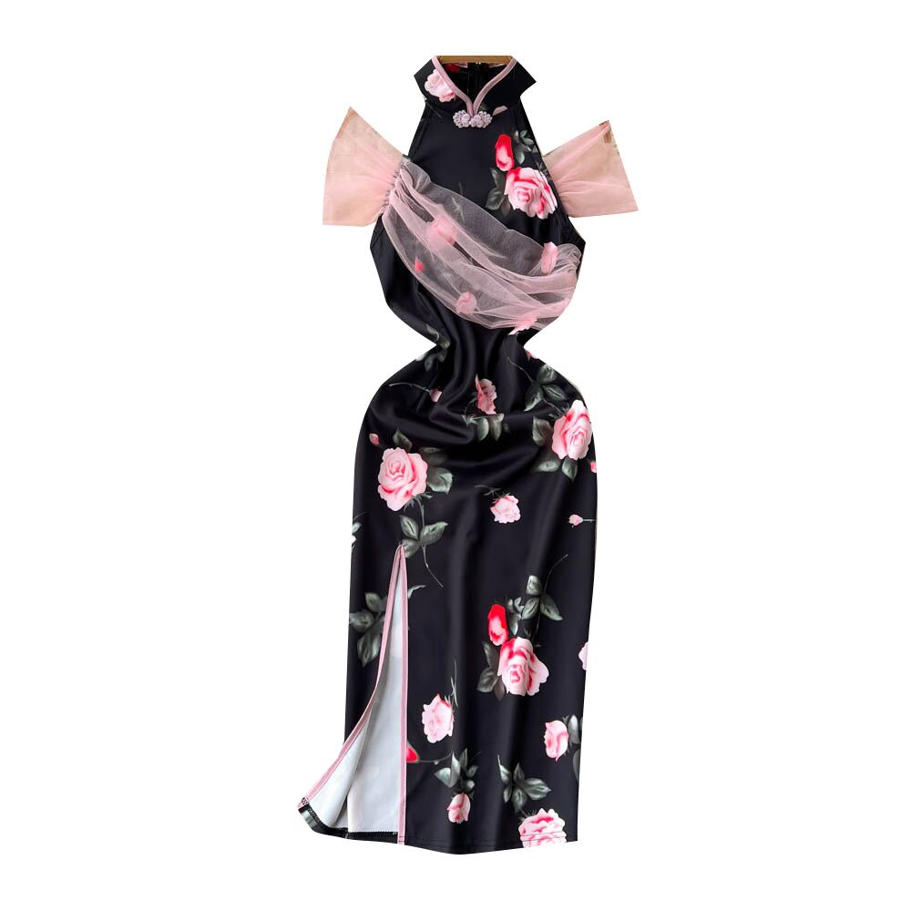 夏のセクシーなファッション吊りネックサイドスリットエスニック風メッシュステッチプリントバッグヒップチャイナドレストレンディ サマー 夏物 lyxaj53528681528