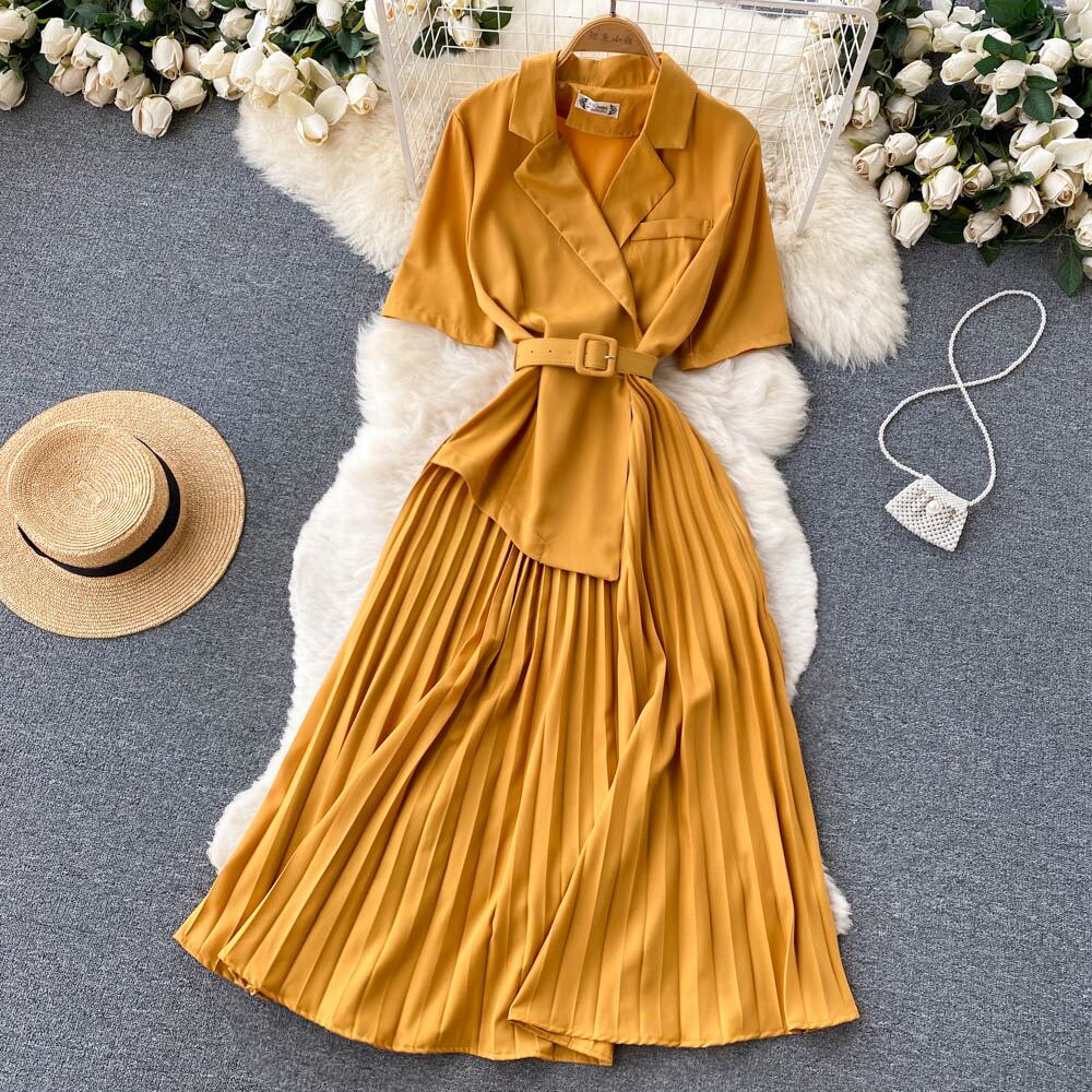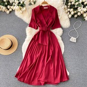 -グレード、軽くてなじみのあるスタイルの赤い気質のスーツの襟のドレスのスカートの夏の婦人服の腰の痩身半袖の長いスカートはトレンディです ロング レッド サマー 夏物 lyxaj54831800080