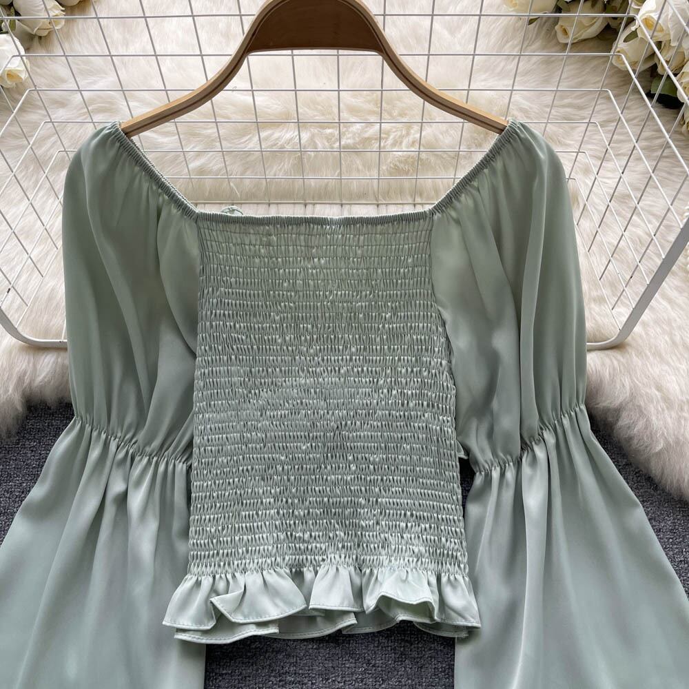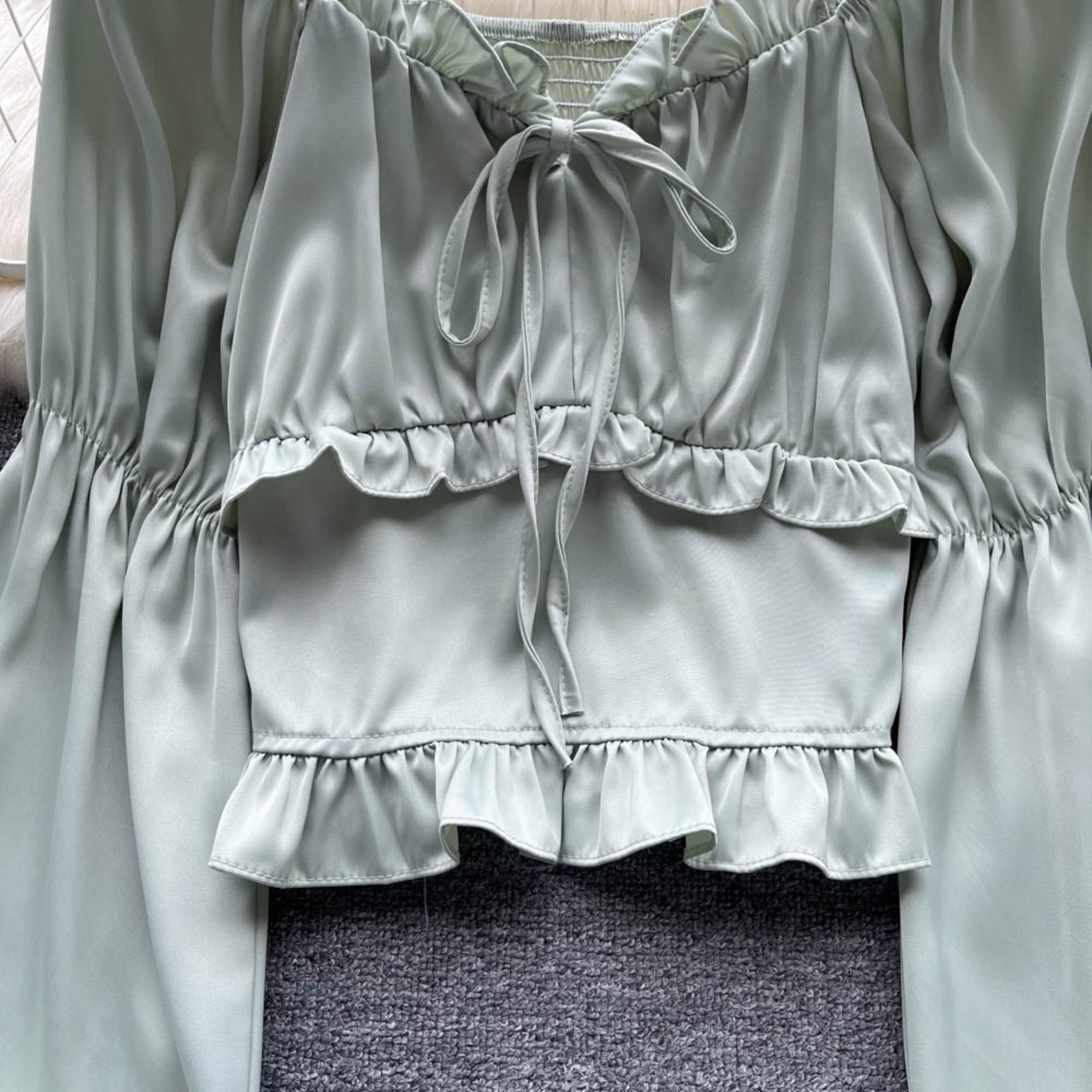 フレンチスウィートなデザインセンスニッチなランタンスリーブシャツトップ 秋 レディース ネクタイ フリル付き シックで綺麗な小さめシャツ ラッフル 大人ガーリー キュート カジュアル オータム 秋物 lyxaj7294817273